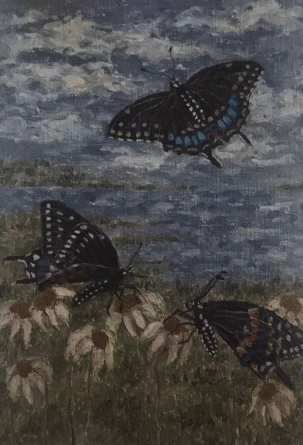 Kaylyn Murphy, Black Swallowtail Butterflies - My paintings are made from my curiosity and sense of wonder in nature. I am an artist based in Rhode Island, US, and only work in traditional oil paint on Belgian linen using canvases I have built myself. Influenced by the impressionists, I incorporate areas of loose thick brush strokes while using a natural color palette. I paint my surroundings using my local landscapes and people as a subject matter to better understand daily life and the mystery that comes with it.