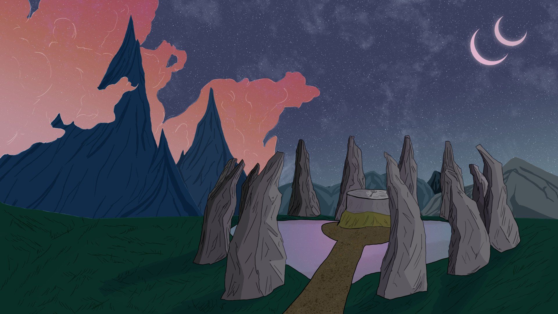 Josh Hyman, A Place of Reflection - This is a digital environment piece that is set within a fictional, supernatural world of my creation. This location is designed to present the idea of peace and tranquillity within the magical setting whilst surrounded by mountains, with the two moons looking down from above within the mystical night sky. I created this world to allow my mind to run free and create a limitless world of imagination.