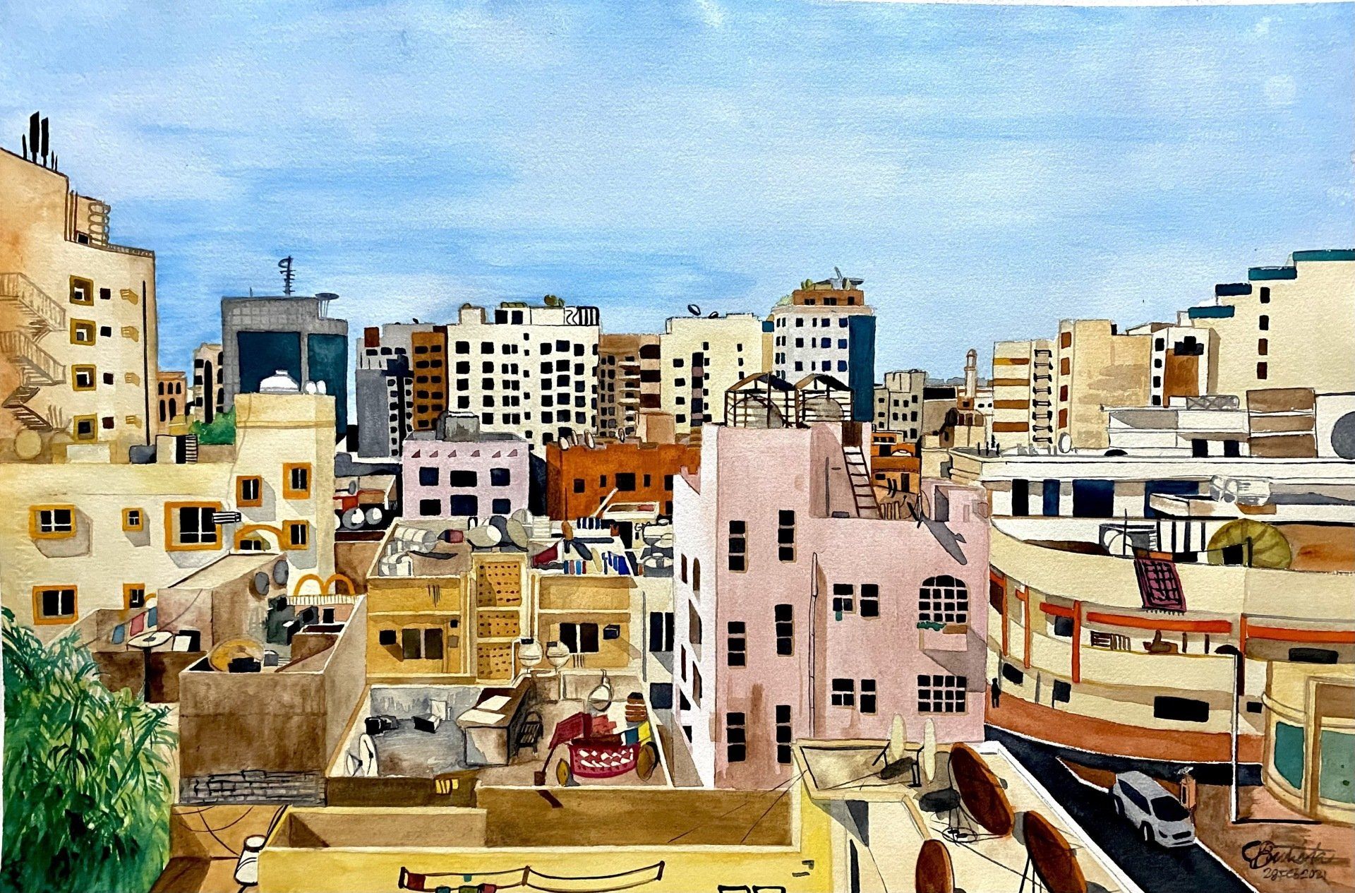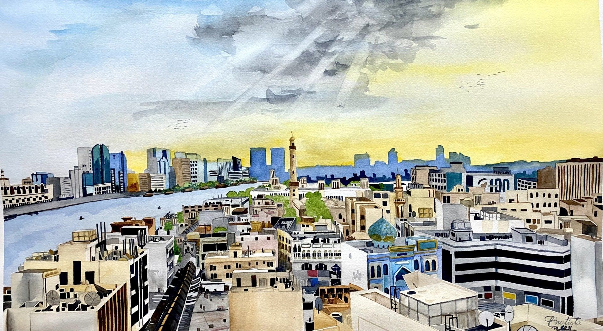 Clarisse Bautista, View of 25 Years - This is a watercolor artwork showing a kitchen view of Rolla in Dubai, United Arab Emirates from the 5th floor. Baxi is a sketcher friend who had lived in Dubai and in the same apartment for 25 years and now has migrated to the United States. I took a photo during his despedida party and surprised him with this artwork. He immediately recognized that it was his kitchen view the moment he saw the artwork. As an artist, I like capturing what is happening in front my eyes at that very moment as change is constant.