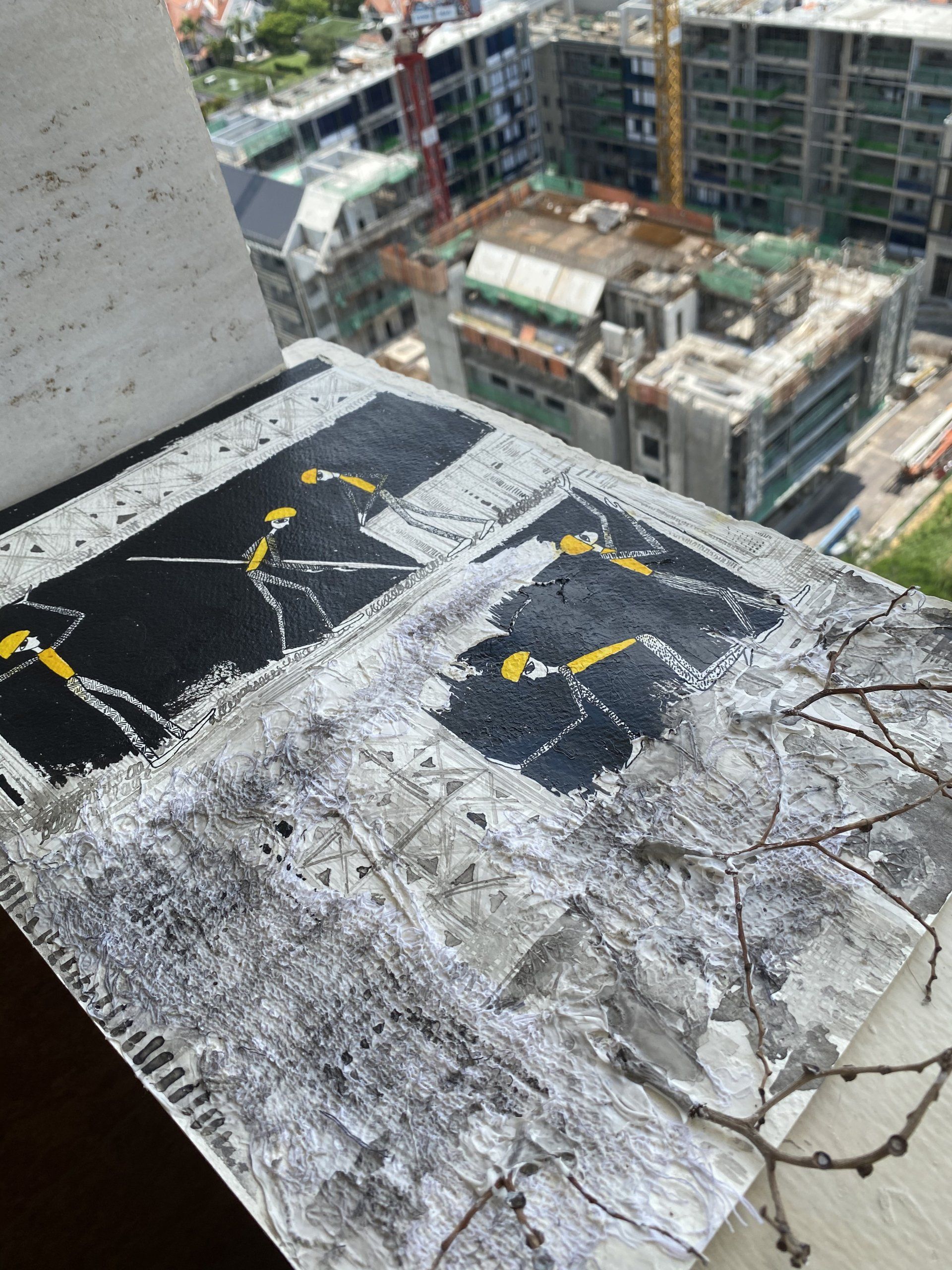Nishtha Pathak, ROOTS - A lot has changed in COVID - and has hit these construction workers hard. They have been staying away from home, with stricter protocols to avoid infections and yet, what hasn’t changed is their contribution to Singapore. No matter the heat or rain, they diligently build stronger foundations for the country. For a flourishing Singapore - the counstruction workers are the true roots.Crafted in Modern interpretation of Madhubani - an ancient Indian art form that embodies the key natural art principles across early cultures. Mixed Media, Ink on paper with handcrafted dip nibs. Every stroke is permanent, and different strokes help define the depth of subjects.
