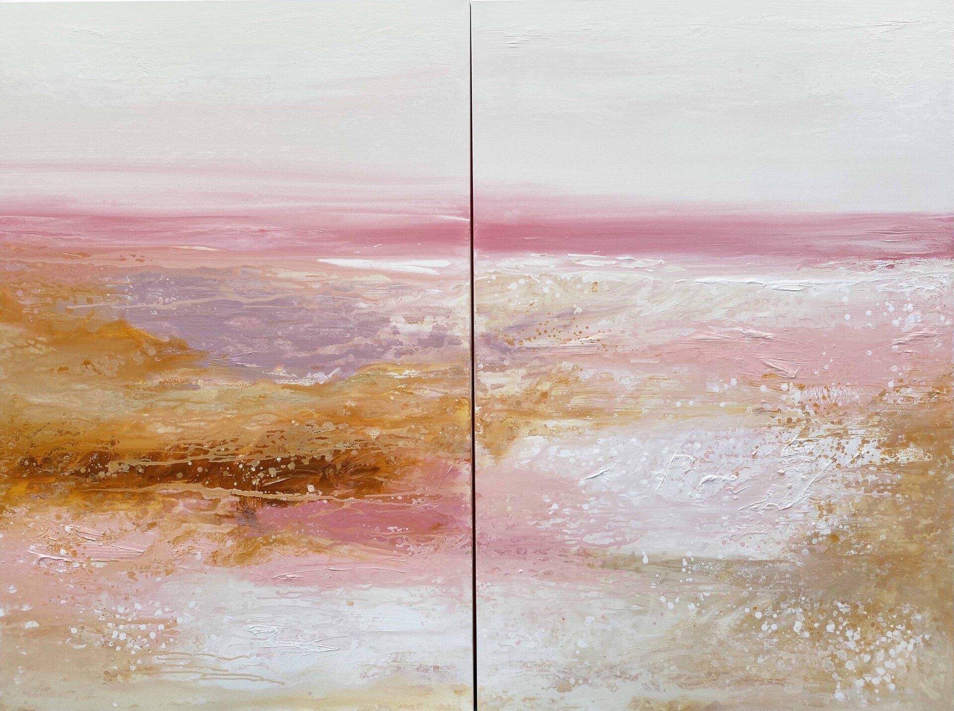 Kathleen Rhee, Pink Beach Day - Translating the landscape as both memory and feeling, artist Kathleen Rhee has a strong connection and love for nature that shines through in her artistic practice. ‘Pink Beach Day’ is a large abstract expressionist work celebrating the Australian landscape, translating the reflection of the gold and pink sunsets against the sand, white wash surf and flowing water forms. Thick rich painterly marks and textures sit along opposed seamlessly smooth paint revealing an electric energy but yet peaceful and calm. This work is heavily layered in brilliant colours of Australian sienna, ash pink, blush, pastel pink, unbleached titanium and white. This is diptych work that hangs 244cm wide and is 183cm high.
