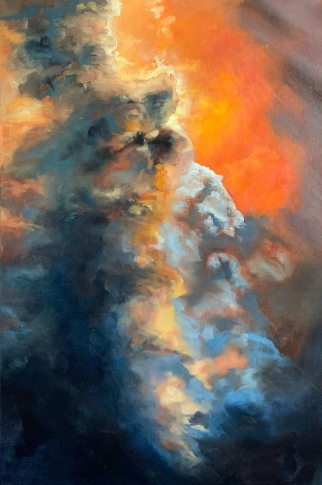 Janine Crum, Looking Up - When the storms of life roll in, artist Janine Crum, has learned to look up and through the rolling clouds toward the streams of light just beyond the bubbling backdrop. This bold skyscape is a reflection on the movement in our troubles -- like the storms of the sky that are always in motion, so are our own hardships also in motion, which we will notice if we simply look for the light.