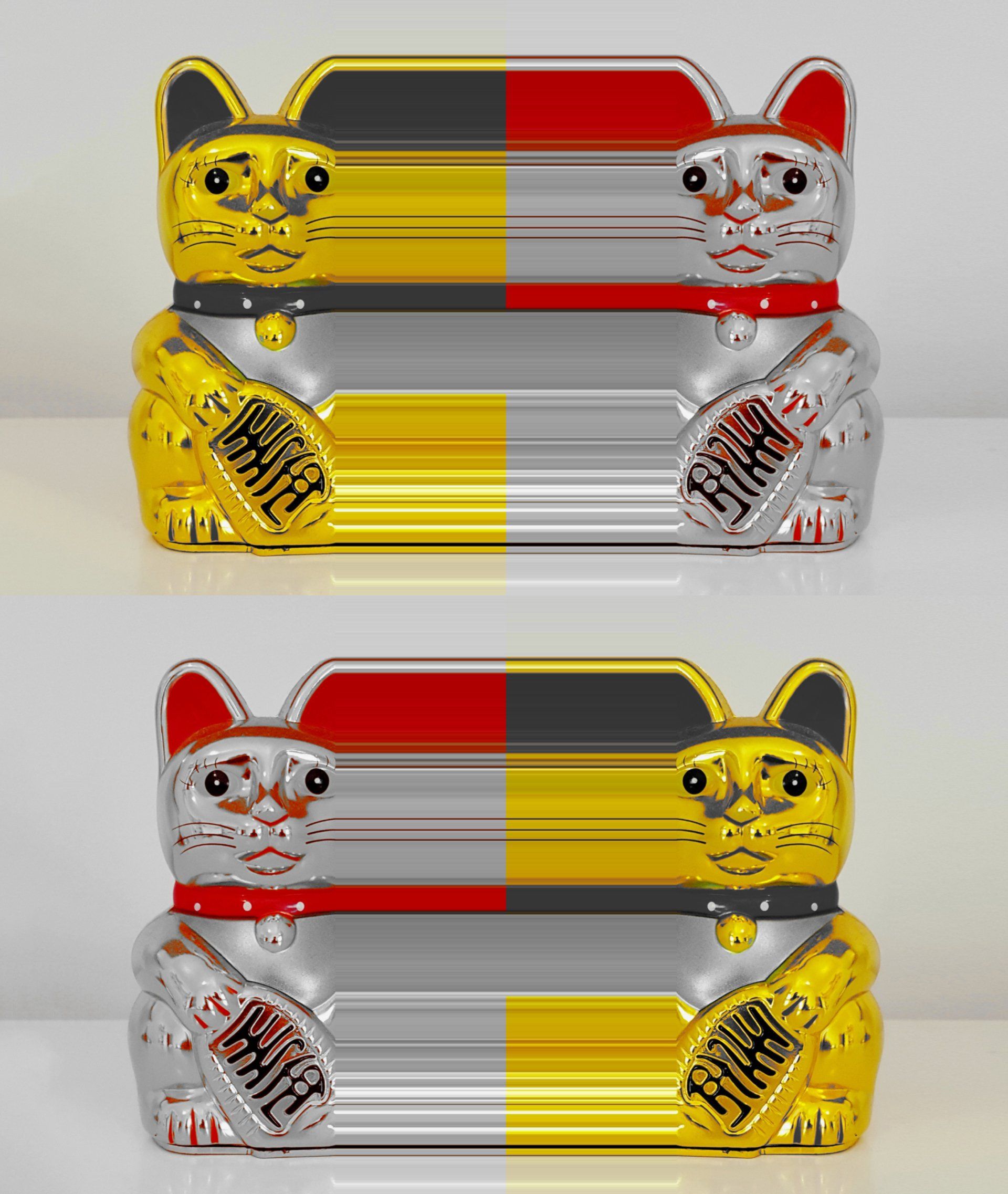 Jared Orlin, Lucky Cats - The Streak - Through my travels and having lived for a period in Taipei, I’ve long been inspired by the ‘lucky cat’ or maneki-neko. It’s not an everyday object in Western culture but it is universally known (and not always understood). Depending on which arm is waving/beckoning, the lucky cat is said to either bring customers or money. For my design, I’ve removed the paws but added a ‘streak’ that synchs them up, making them as one. Or, separate but connected. The inspiration here is a comfort and safety in knowing things fit together and go on, perhaps indefinitely. This is the thinking behind most of my photography and digital art under my brand, iHeart Pop Art.