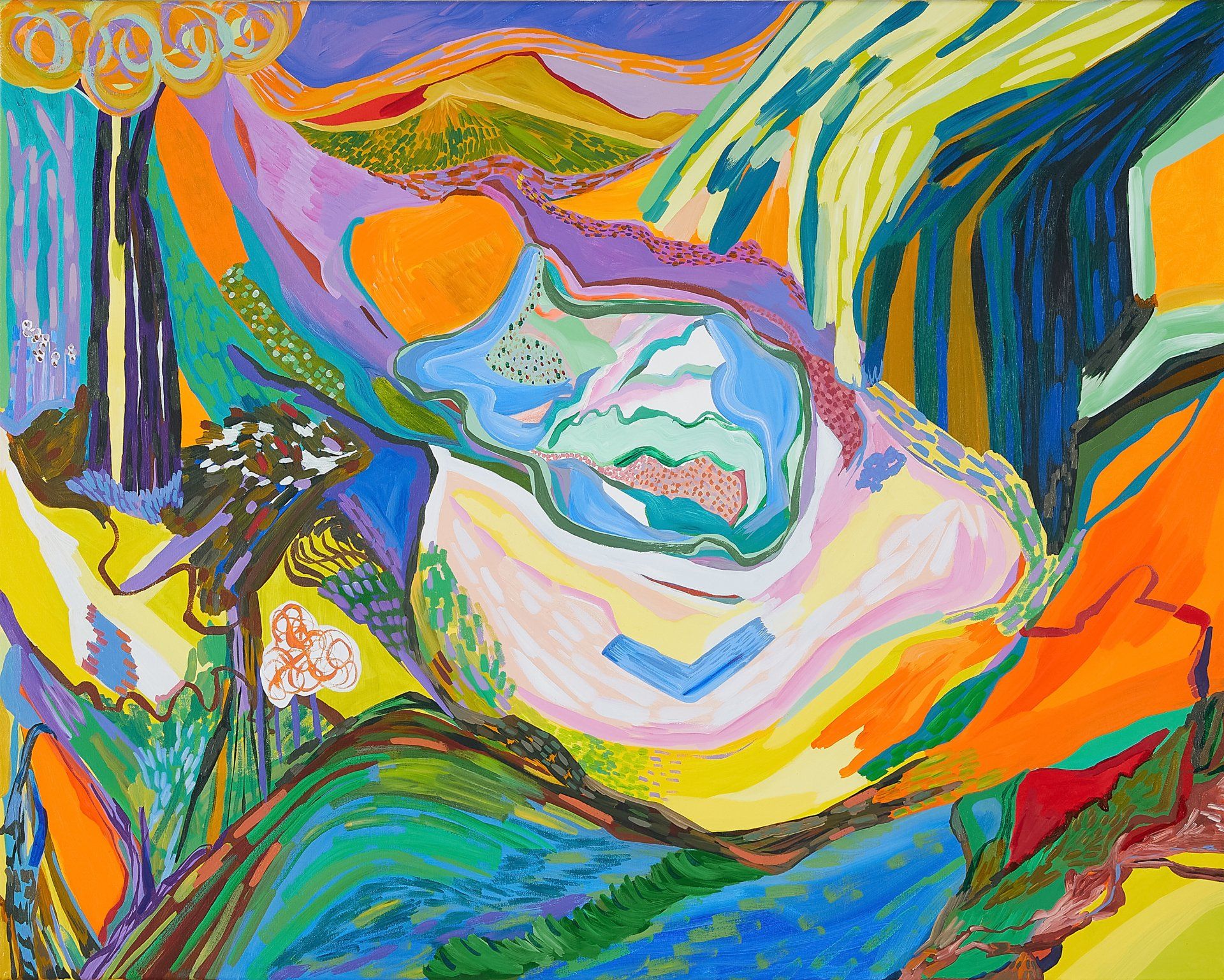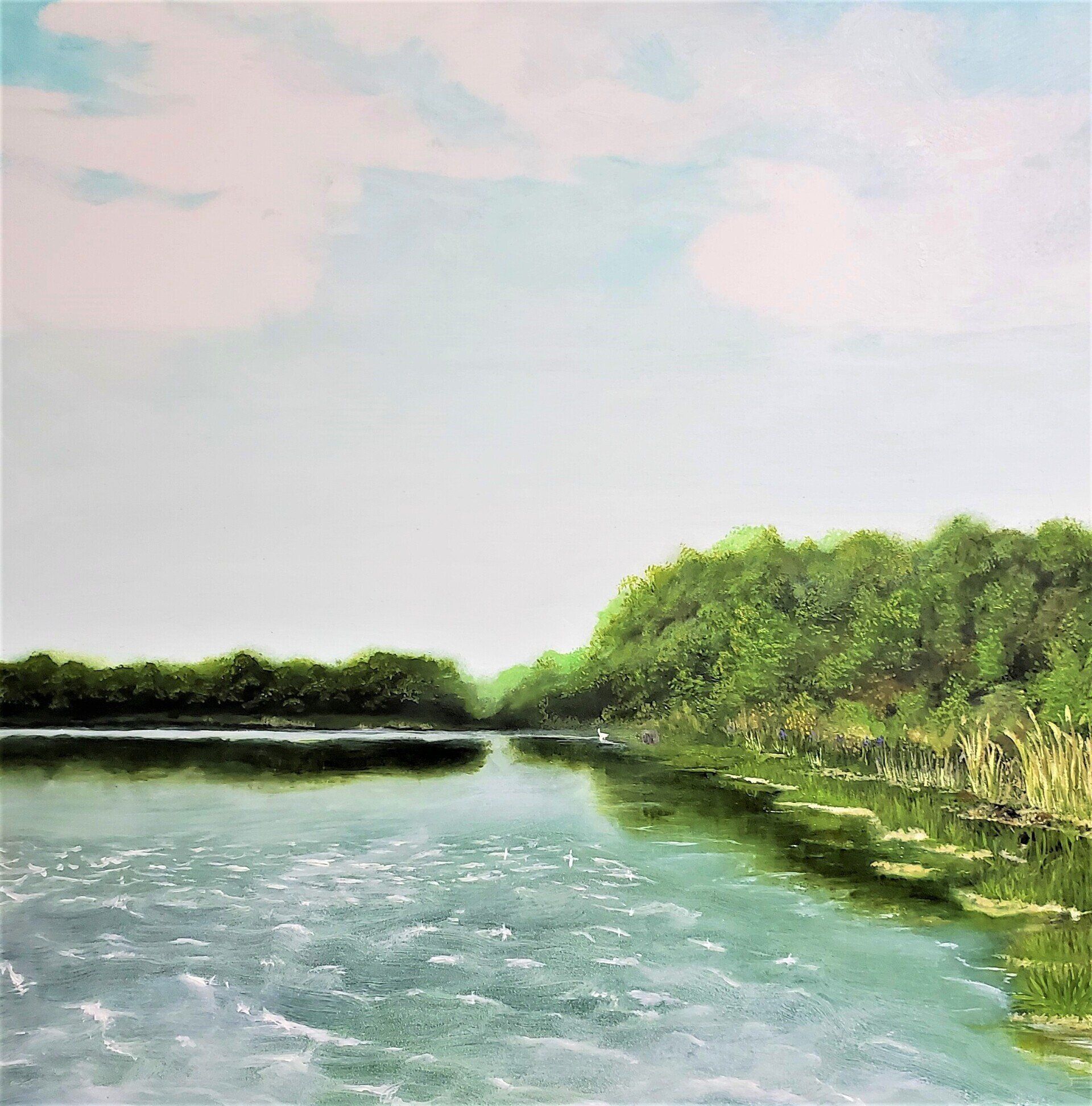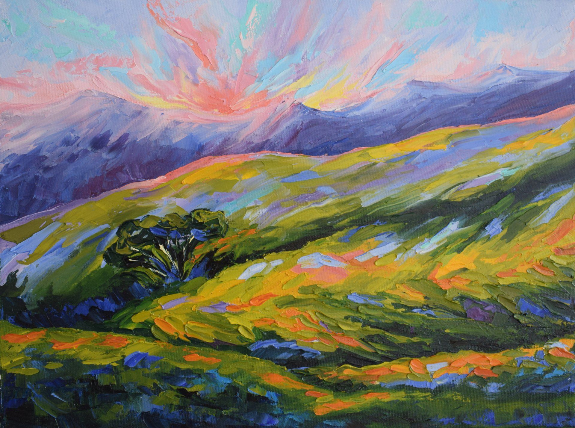 Mónica Casanegra, MEMORIES - This landscape painting was inspired by memories from hikes and observations, not just visually, but also the sense of smell and touch, from places I have been, before this global pandemic. With this in mind, “Memories” examines nature as a visual sensation that permeated my senses, creating emotions that were felt while observing the scenes. The effect of light conveys the cycle and rhythms of nature, which is without beginning or end and is changing constantly. Witnessing such effortless natural beauty is what inspired this painting.