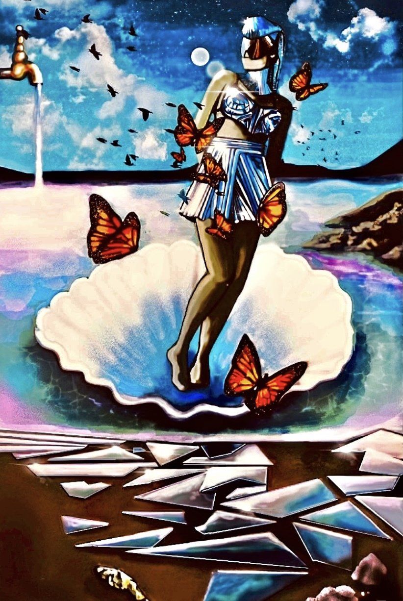 Heike Blakley, Future Reflections - I wanted to convey the spiritual process of a shattering ego and rebirth. I chose the colors to represent the deep emotion, wisdom, tranquility, strength and resilience that comes with spiritual growth. Feelings (water) then dries as it leaves reflections of a broken past that’s no longer needed. A “death,” (dead fish) of who we once were is all that’s left to review and soon to decay going back into the universe. Self reflection and metamorphosis is the basic theme in most of my art, I prefer using aliens as a representation of the alienated feelings we as humans experience and I feel it lessens the chance of color/race/gender bias in order to convey messages more easily.
