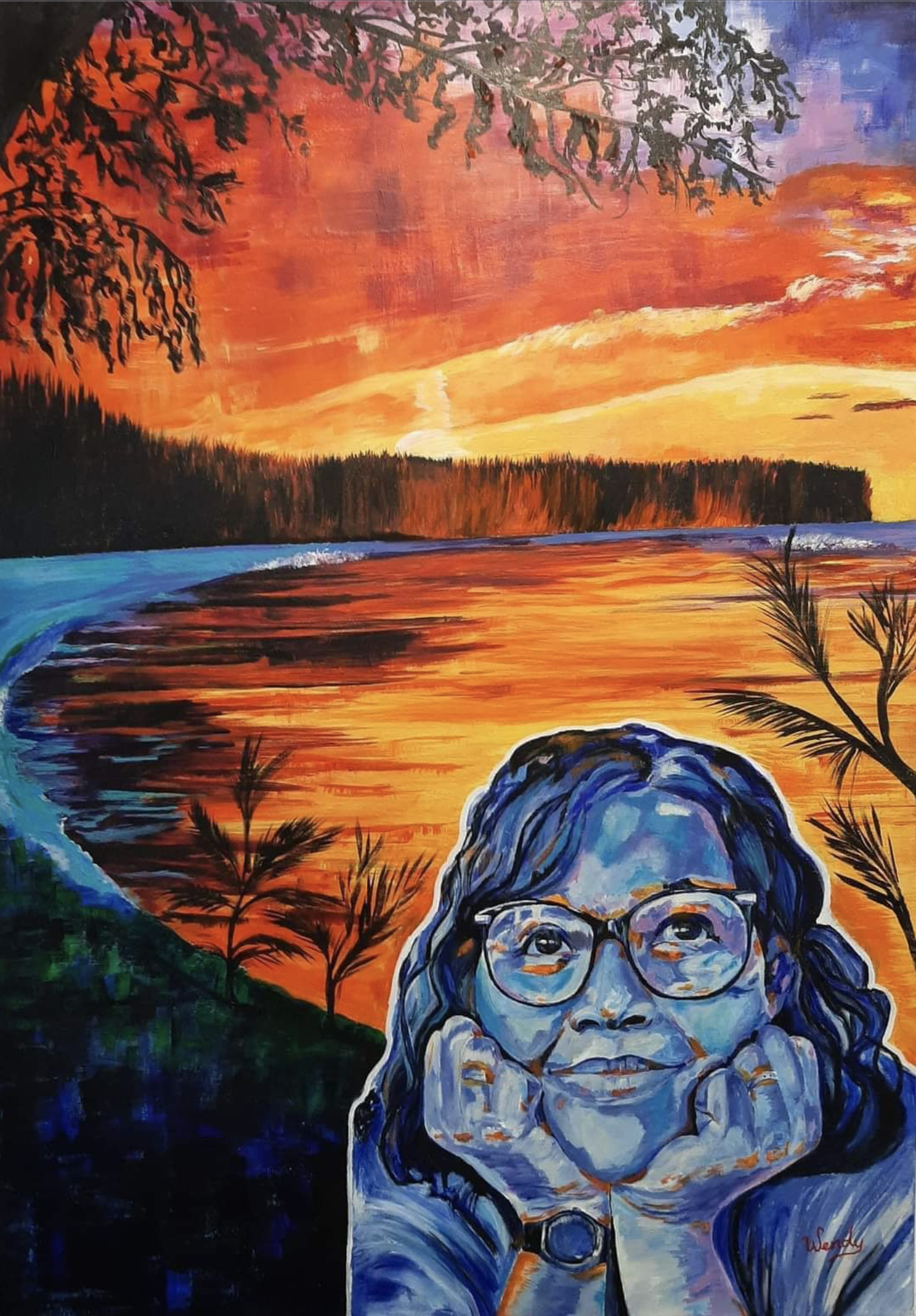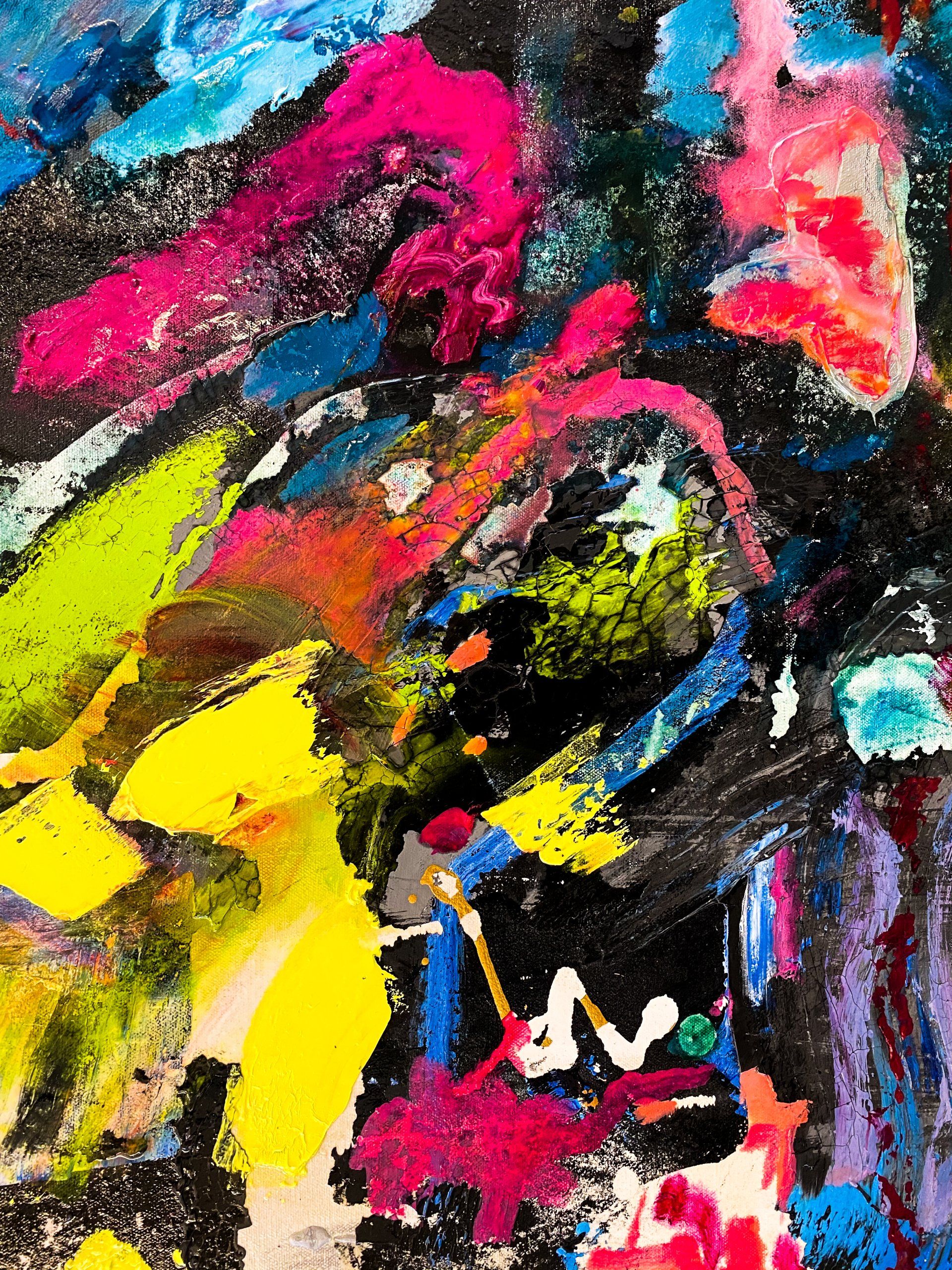 Kristianna Gasparjan, Selflove - As a newly immigrated individual, I am finding transnational confidence while holding onto selflove with purpose. The abstract painting combines adventure, romance, joy and SWANA ancestral remembrance while grounding on certainty even through new adjustments. Capturing the self-loving fragments in my past, present and optimistic future. Some parts stand out alone, but I perceive life through layers and context in which effects are intervened.