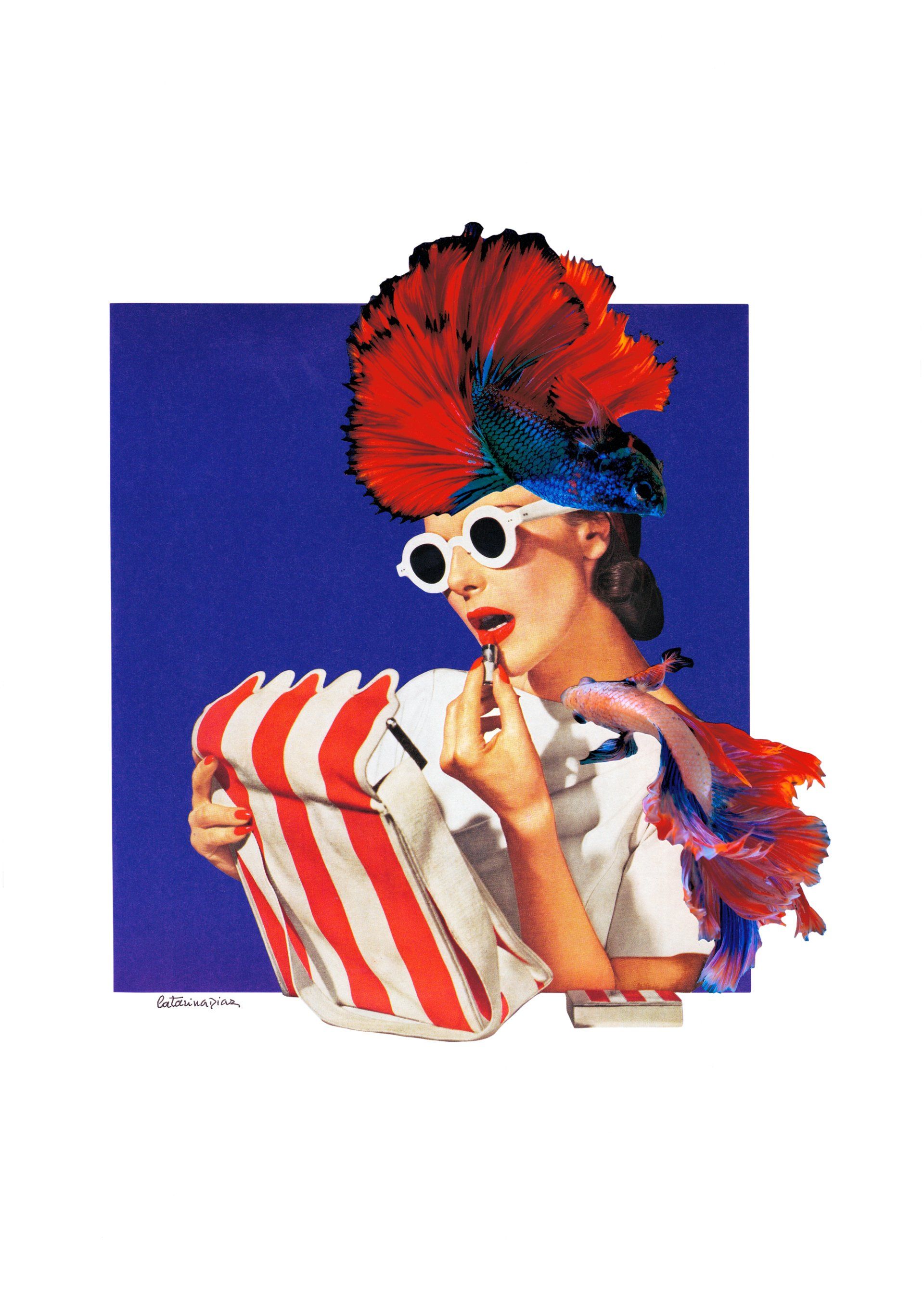 Catarina Diaz, So pop - I consider my art a way to celebrate life. So Pop illustrates a young woman wearing white sunglasses applying lipstick. The strategically placed beta fish, one as a fascinator and the other as a shoulder applique, reference fierceness and boldness. Bold reds and blues juxtaposed with stark whites allude to the vibrant palette of Pop Art. The image is a visual representation of high fashion and popular culture. Furthermore, the collage references commercial items and recognizable advertisement imagery.