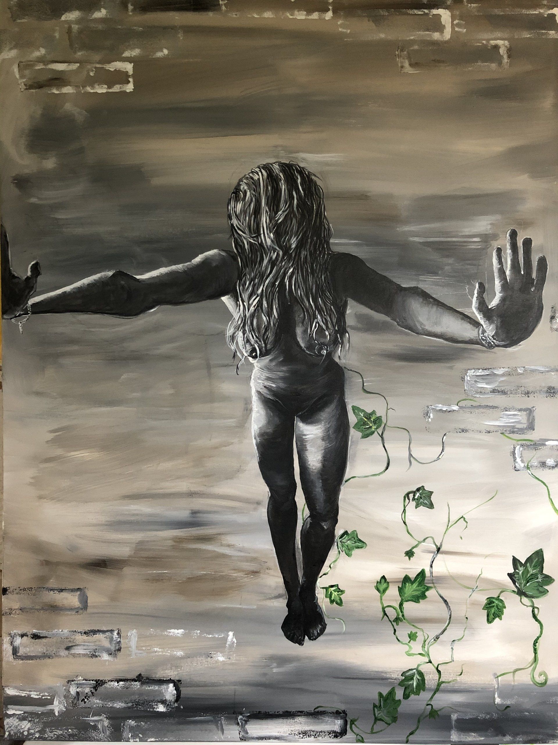 Lorna Bent, Dolor - The painting depicts female vulnerability, fear and the embracing of a period of great change. The nudity is also a sign of exposure and moving into uncharted territory. The date shows the date of the artist’s mother, from where these feelings evolved, and the comfort of expressing and dealing with grief through creativity and art. The subject is pushing ahead through the barrier of grief, breaking down the walls as she deals with the grieving process. The ivy symbolizes life connections and feelings, and the fact that memories are intertwined with life and will always remain strong, and the hope that spring will soon come again.