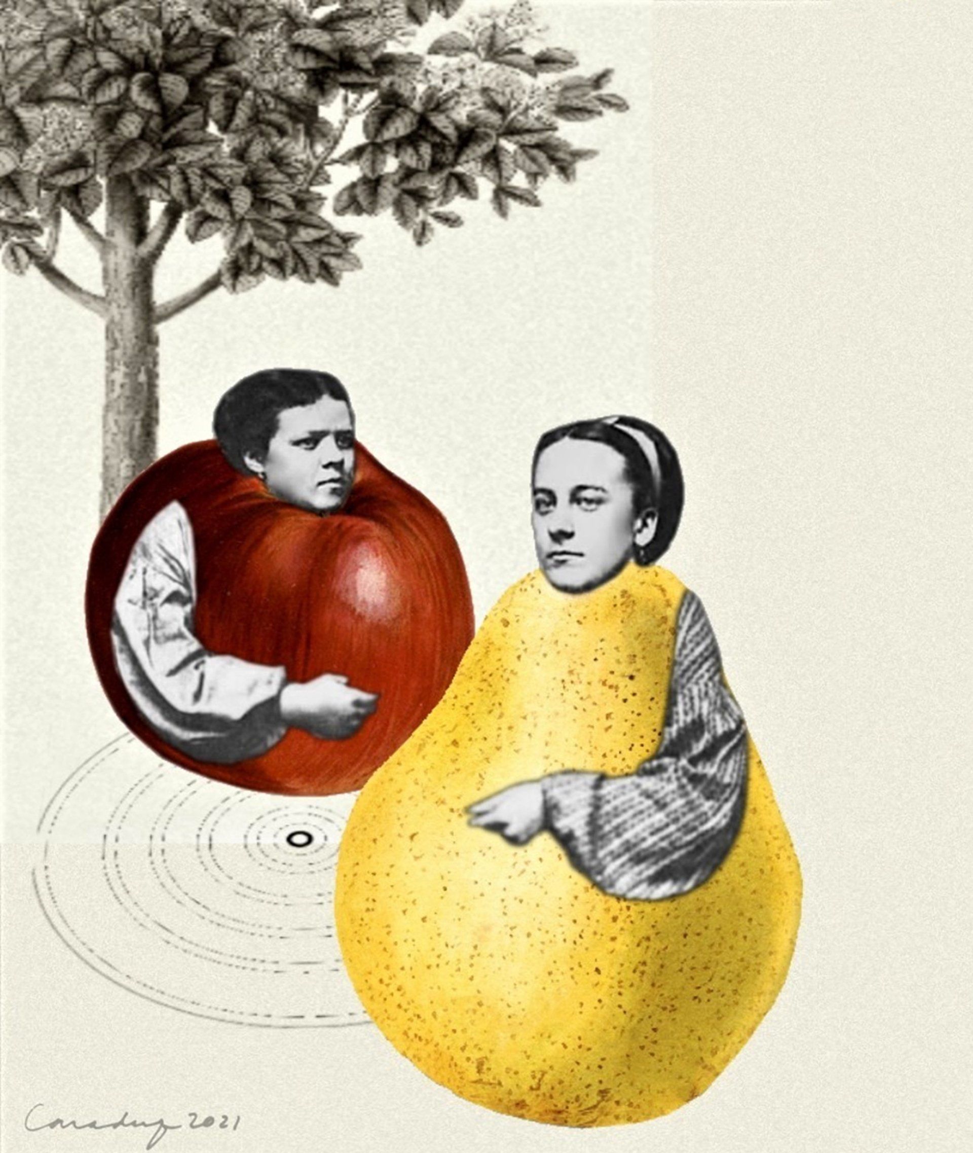 Carmen Angela Yandoc, Somatotype - “Somatotype” is a satirical commentary on body stereotyping comparing women’s shapes to apples and pears. Current social media platforms have taken body shaming to a new level with countless fat-shaming memes and fat-phobic posts which leave lasting consequences. Although males aren’t exempt, criticism on shape and size is more prevalent in females. Ripe with humor, this visual rendering of fruit metaphors is a protest thrown at the ridiculous passing of moral judgments based entirely on superficial attributes. Adopting what Arthur Koestler said in his 1964 book The Act of Creation, this piece intends “to make us suddenly discover the absurdity of the familiar and the familiarity of the absurd”.