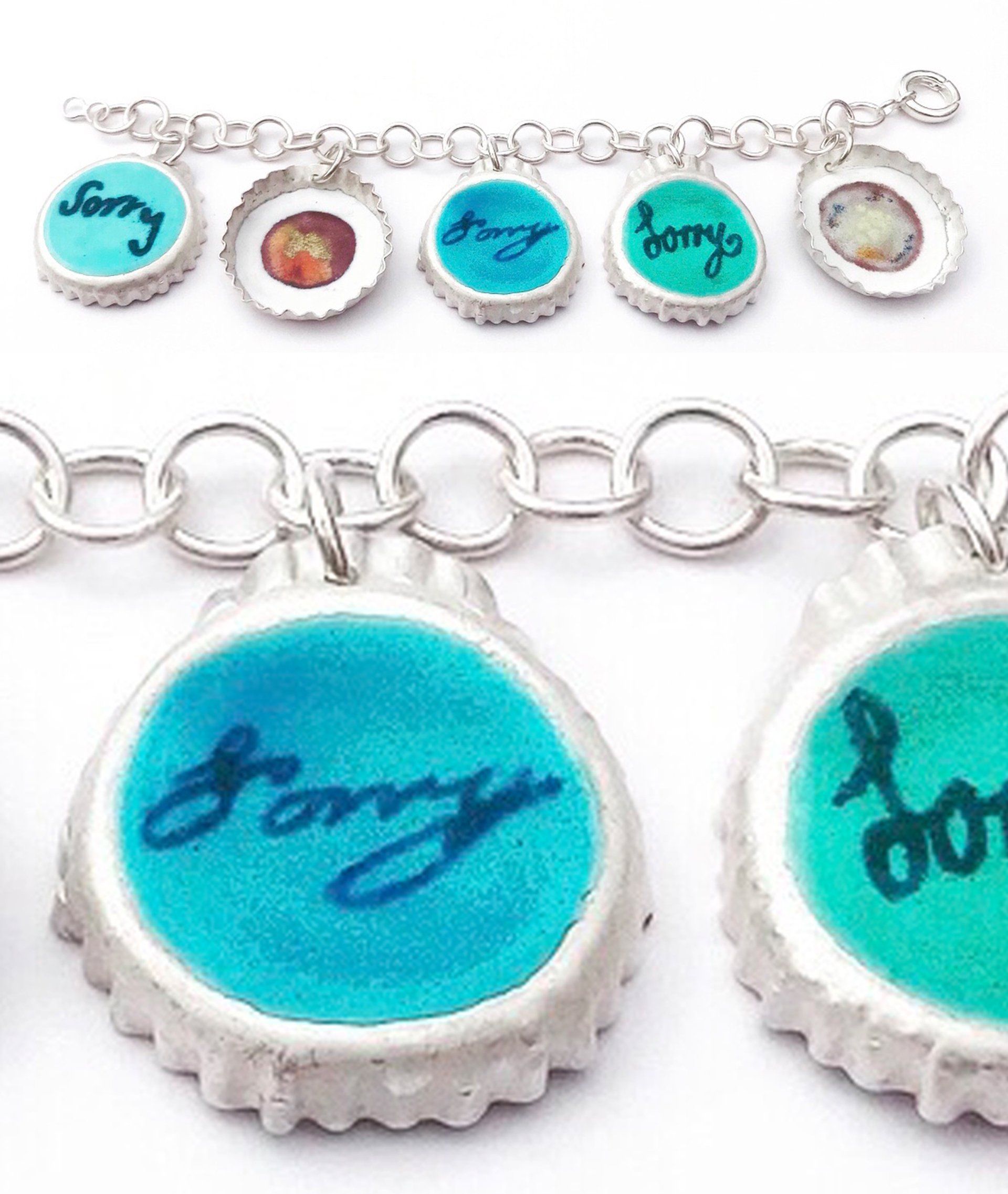 Penelope Burnett, The ‘Charmer’ Bracelet - This piece was handmade as part of my final degree project ‘Behind Closed Doors’ which is to raise awareness of domestic violence and coercive control. It is inspired by the traditional charm bracelet and a real life story about alcohol related violence and control. The Charmer Bracelet is full of ‘sorry charms’ bought as apology gifts by the perpetrator to ‘win over’ the victim and to put on a false front for the out side world to see. 1 sorry 2 sorry 3 sorry 4... Hidden bruises behind the apology gifts.