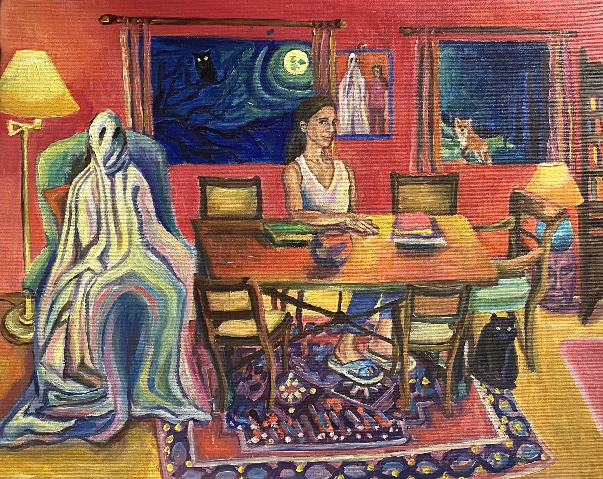 Antinea Boletsi, a ghost story - What about ghosts? I don’t know why but often at night especially, I feel haunted. I feel this presence in my space, like it’s always watching me, very discreetly, but I feel it. I have never really seen it though, except for hypnagogic hallucinations that I have experienced sometimes... So having watched the movie “a ghost story”, I was inspired to depict this special feeling as an image of a classic ghost underneath a sheet. Many don’t believe in ghosts, others have seen them, some are scared of them and don’t even want to think about it; I think there is definitely another extraordinary dimension to the world, a hidden one we cannot see unless we allow ourselves to dive into the fantastic unknown.