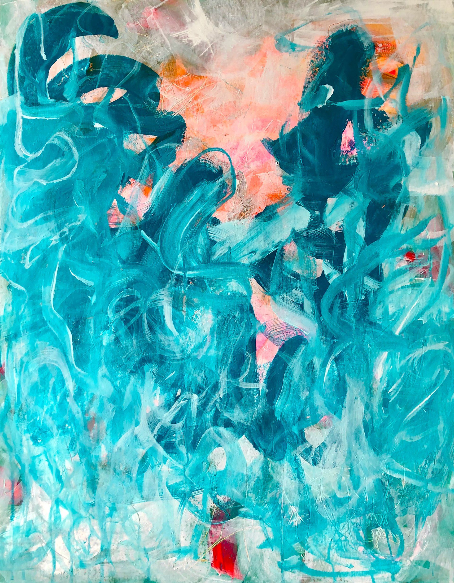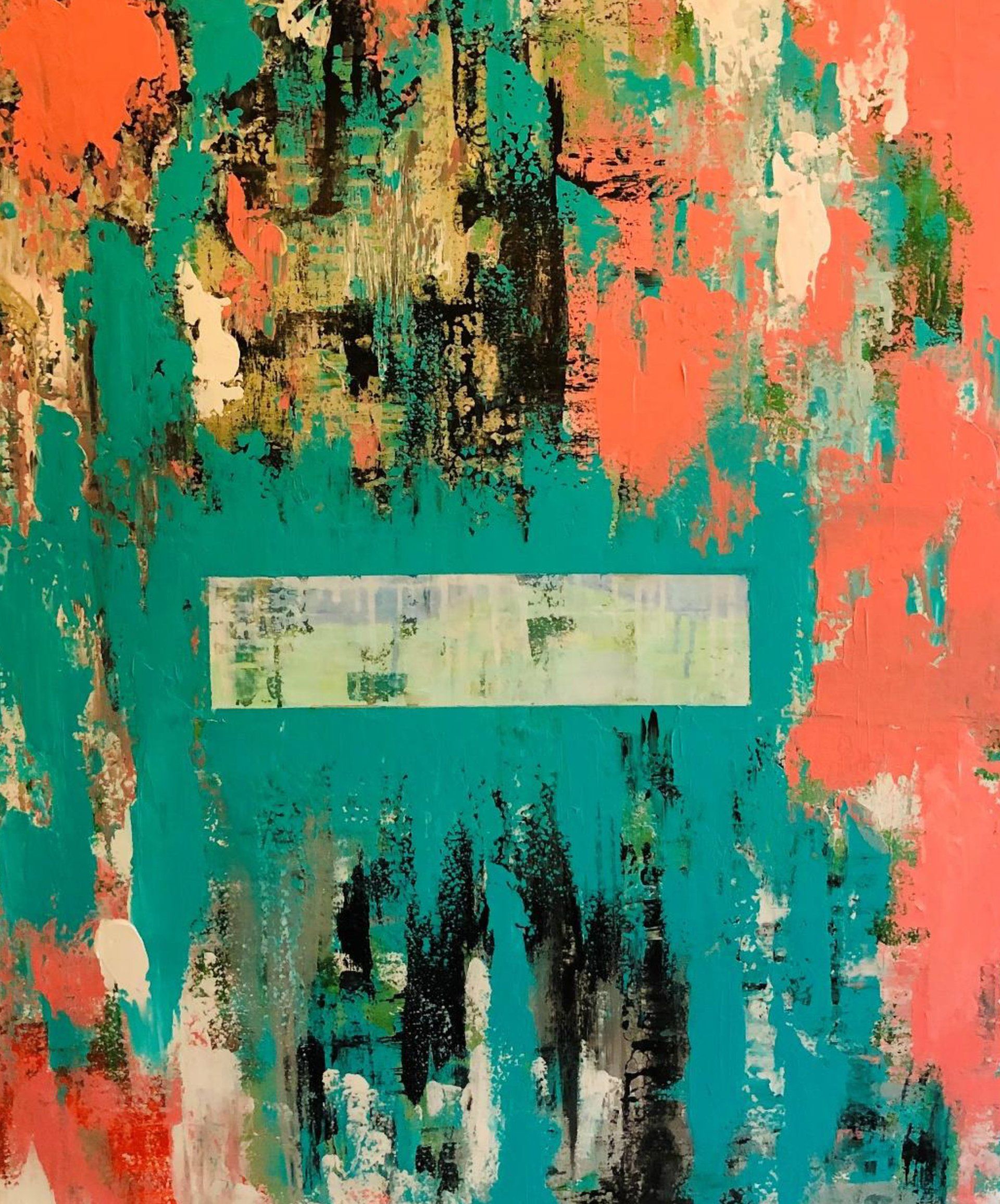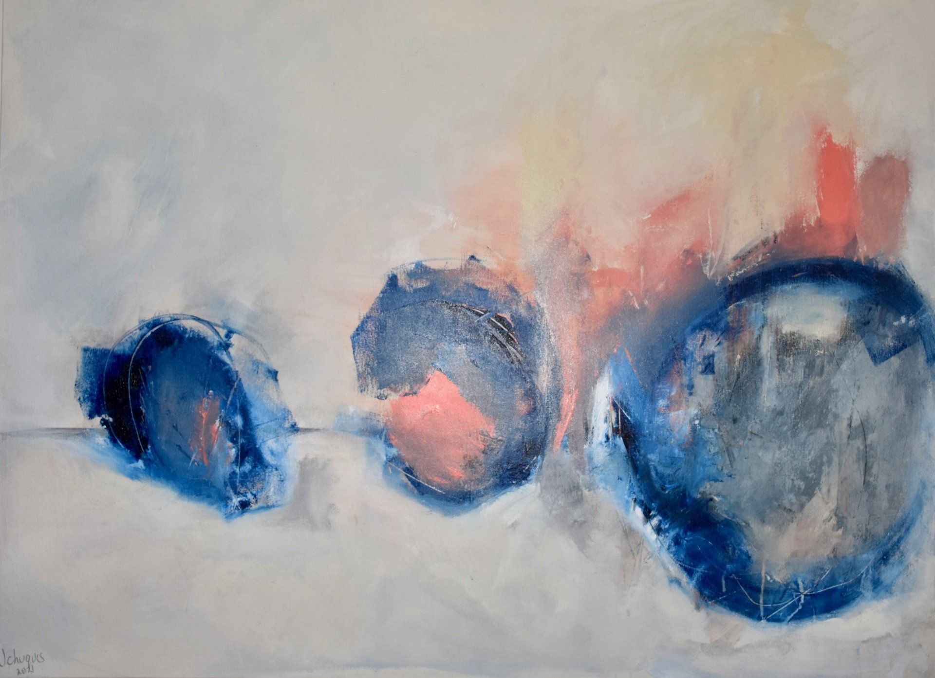 Julia Chuquis, A New World - I believe in our ability to alter our energy to manifest a better world. In this piece the three spheres represent matter, life and mind. The colours I used are coral, to represent the energy that flows through everything, and blue to bring about the connection with nature and our rich source of water on earth. Painting abstract art that expresses emotions, adversities and experiences that humanity endures or celebrates is something that deeply nourishes my soul. I title my artwork to reflect what inspired me when creating each painting. I hope that my artwork invokes the viewer’s individual emotions and induces further exploration and personal interpretation.