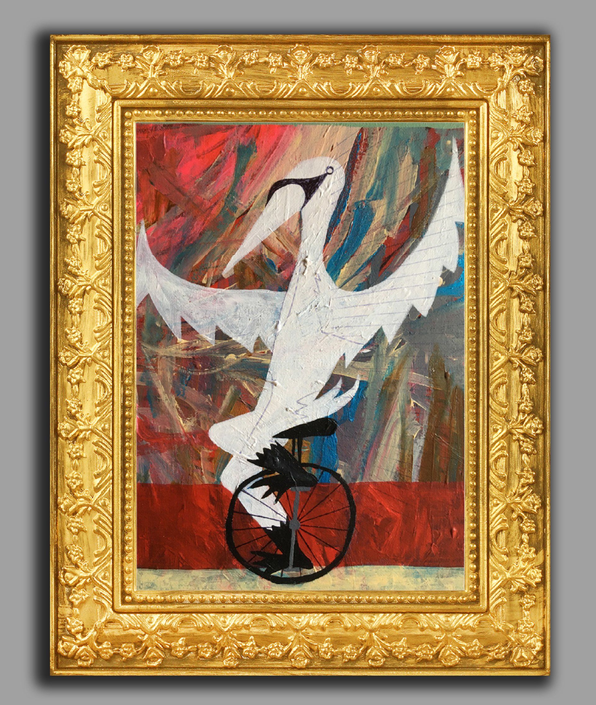Samuel Keysell, Swan On Unicycle - Swan On Unicycle’ is a selected painting from the book ‘The Swan Circus’ by Samuel Keysell. It’s a book of paintings and a short story about swans being captured by a circus and made to perform. The book is available for free, via direct message (@samuelkeysell) on Instagram. Samuel Keysell also works as a musician under the name ‘Febueder’. His paintings have been shown at Boomer Gallery and his animation work featured on Clash Music.