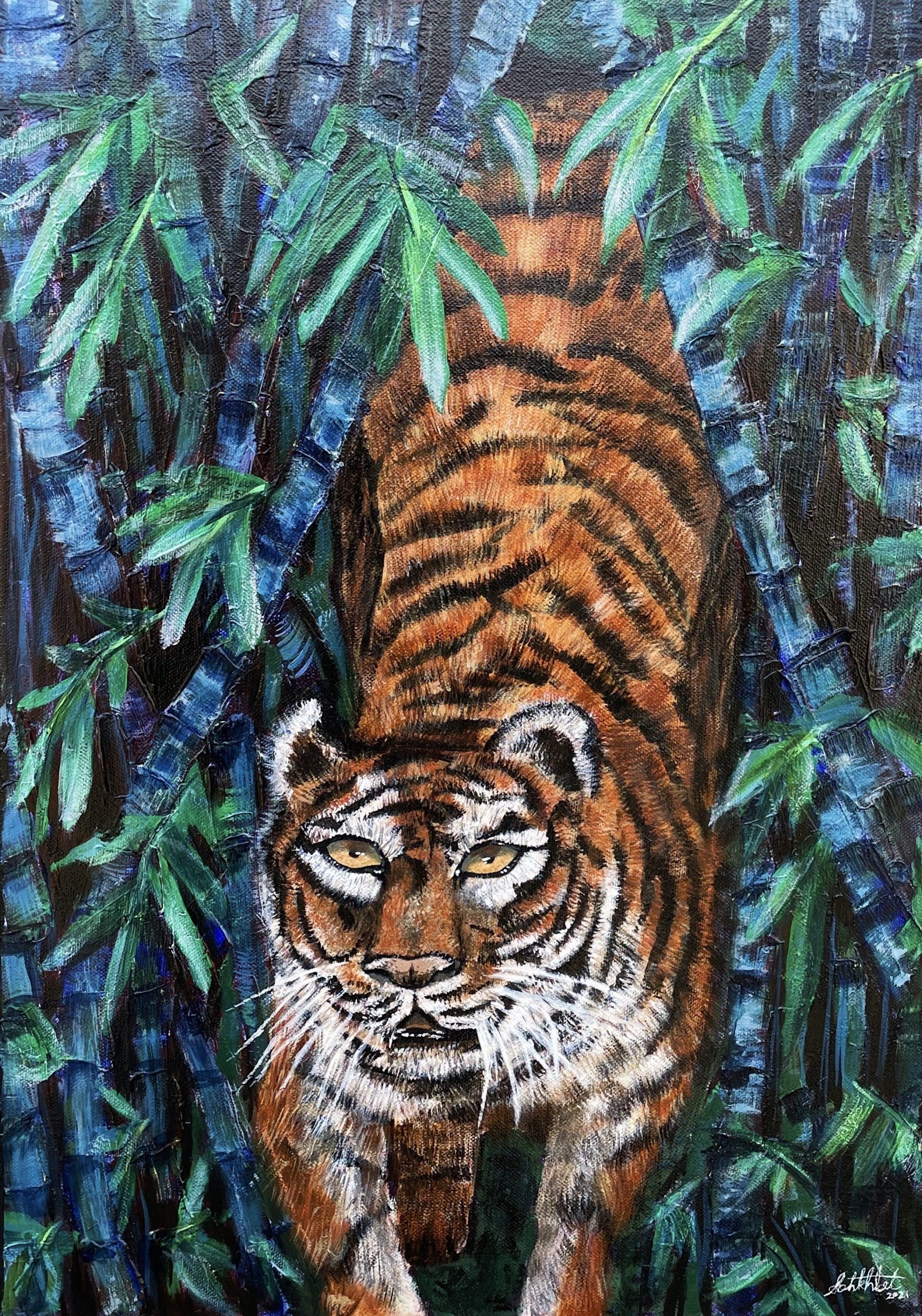 AIMEDAPHI SOHKHLET, FEROCITY - This is a textured acrylic painting that is 42 x 59.4cm in size. I have named it FEROCITY as I want every person to witness and experience their own strength on looking at the tiger in the painting. FEROCITY is a painting that has been created to bring forth every persons inner power and true self with no fear of anything. I have created this piece of art to allow people to bask in the greatness of their own strength.