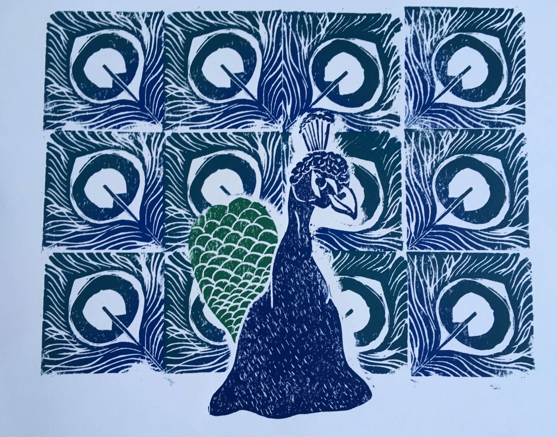 The Peacock and The Printmaker Heather Moore, Elegant Peacock - Stunning, intensely coloured plumage adorn this original print of a glorious peacock. Peacocks have become somewhat of a renewed obsession of mine in recent years - they’re just so beautiful. As a child, I’d visit the animals at Walton Gardens and spend ages watching the peacocks showing off their feathers. These memories have stuck with me all of these years and so seeing peacocks always brings back the nostalgic feelings. Made up of three blocks, the feather repeat pattern was first printed using a mask to leave the space for the green plumage and main body of the peacock. The piece is printed in oil based inks chosen for their intense colour.