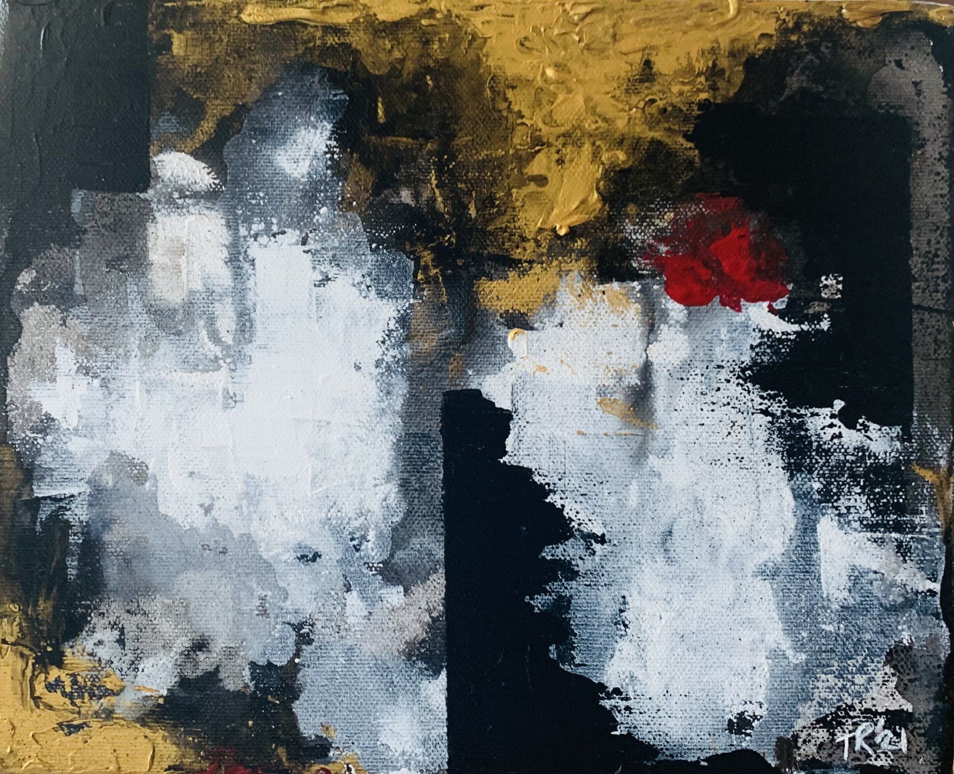 Trisha Dullu, Meet me where wild things grow - I have always been fascinated by the polarity of light and dark and competing opposite forces. I instantly feel drawn to any such dichotomy. It is intriguing to realise that I more often than not always have an emotional response to such surroundings and ideas. This piece is a representational outcome of this duplexity. It shows the contrast between black and white and between movement and stillness. I have worked on this painting in many layers, watering down between layers to create lucidity. The contrast & competing nature of Red & Gold adds drama and interest to the whole piece.