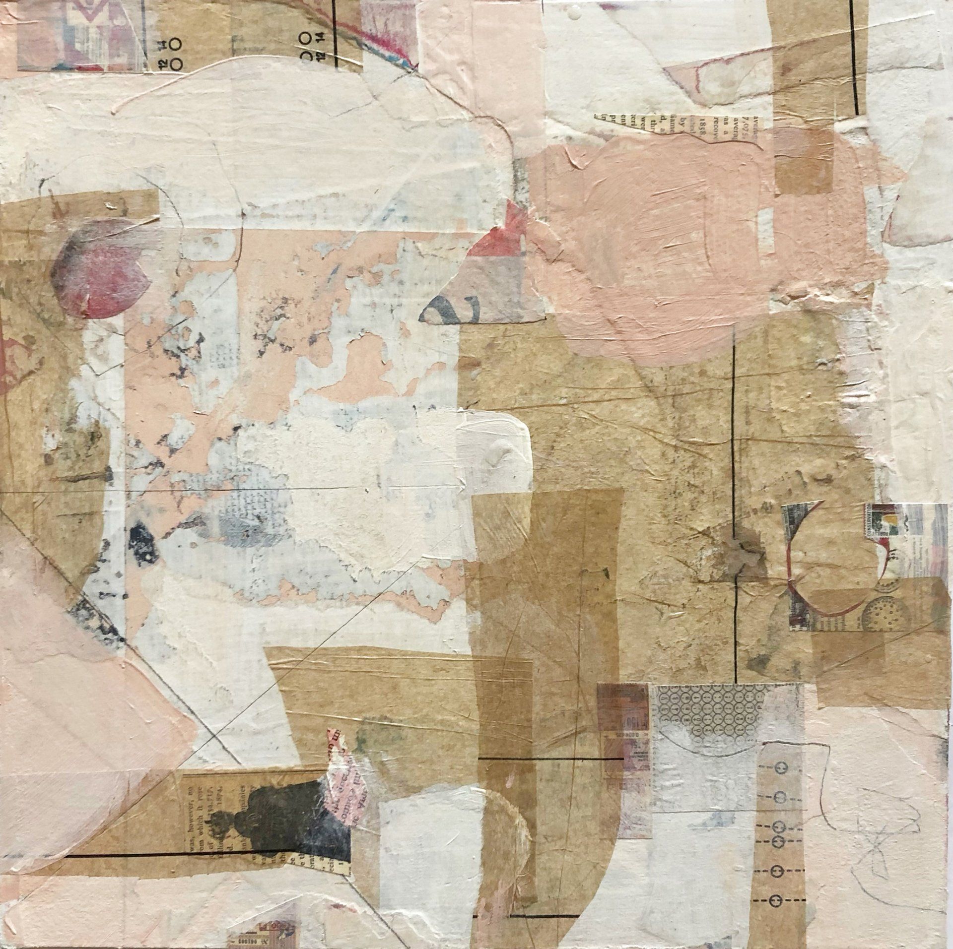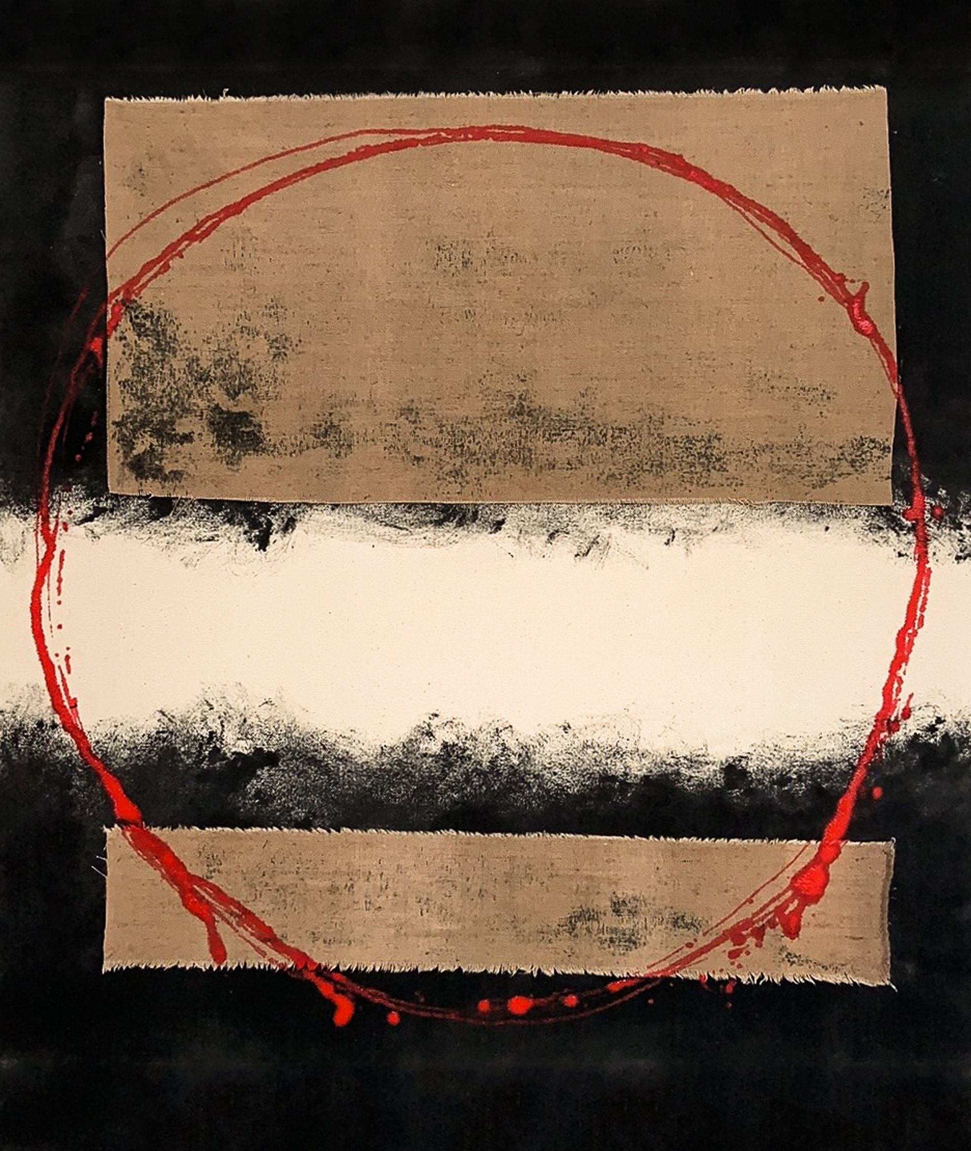 Mark Burrell, ‘The Path Not Taken’ - April 2021 - Acrylic, enamel and fabric on canvas and board. 61cm x 61cm x 3cm. This piece was one of a series that explored the theme of mortality in these difficult times. The path seems clear however, the edges are blurred and it would be easy to stray from the path. - out of the light and into the dark. The fabric pieces are islands of solidity but show the background seeping through, they could be bandages. The red circle has connections to blood but that was not the primary intention. The circle is a symbol of ‘self’, and places me into the painting. It is also fluid and moving and adds a dynamism to the picture plane. Maybe your path takes you from light to darkness, or darkness into light - maybe that is the way of it.