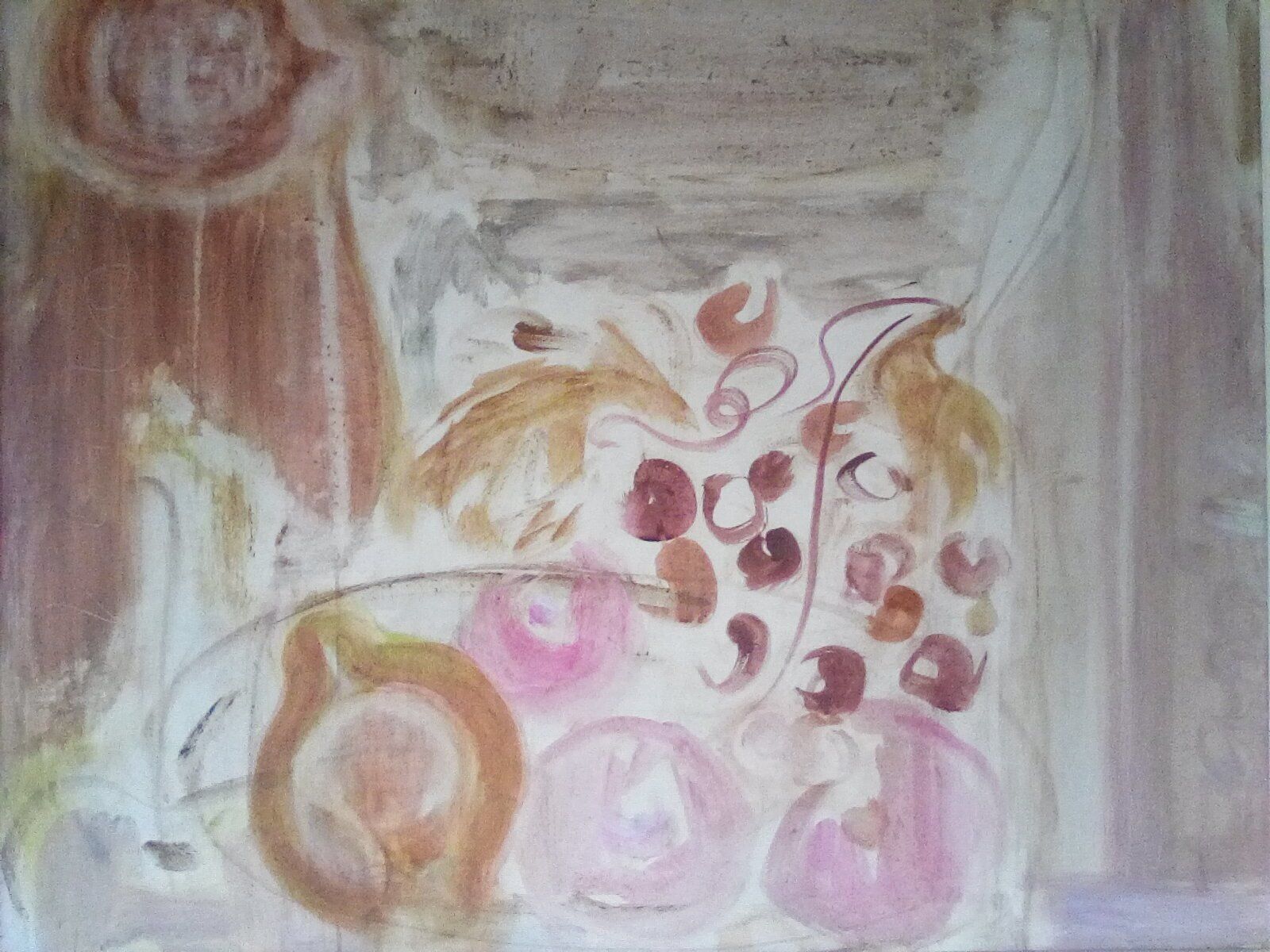 Antonia Monson, Still Life with Grapes (Waterbased oil on canvas 2019) - My paintings are rooted in the image of the still life, exploring colour and harmony in the relationship between motifs. My inspiration comes largely from the light and atmosphere of rural Italy and France, and the rich limestone valleys of the Cotswolds where I live. I work with loose painterly brushstrokes and sometimes my fingers to keep the painting soft and fluid. I aim to evoke mood with colour. I trained in the 1980s at Bath Academy of Art under Jackie Harding. My influences especially include colourists Matisse, Bonnard, Balthus and the early Italian painters.