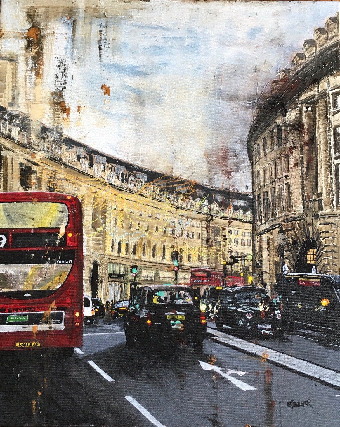 Carol Foulger, Good Times - It depicts the build up to Christmas and the hustle and bustle and excitement that being in London at this time of year creates. I wanted to encapsulate the good times so many of us have experienced in our glorious capital city and the hope that we will once again be experiencing those good times very soon. This painting is in contrast to my previous artwork “Lockdown London”, which I was lucky enough to have featured in issue 15!