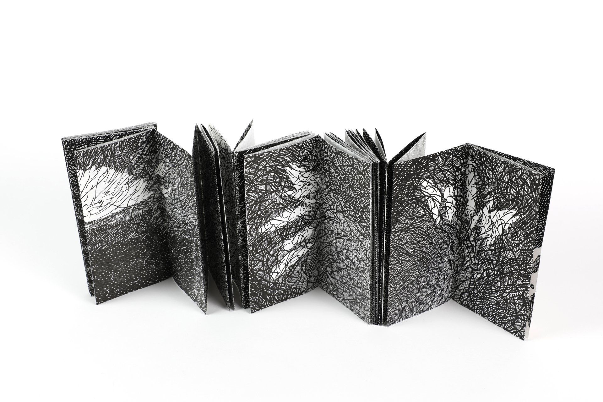 Ben Hendy, Self Portrait - Self Portrait is a concertina bound artist’s book consisting of hand-burnished linocut prints on 25gsm Mulberry paper. The imagery depicts sections of the human body on a magnified scale, closely examining the textures of skin and patterns created by hair. Small dots and dashes form most of the mark making, conveying a sense of subtle tonal variation. Each fold of the book is perforated, offering the viewer an opportunity to create their own larger image, or self-portrait, by pulling the book apart and rearranging the pages. Artist’s books offer a tactile experience which framed prints on a gallery wall cannot, providing the viewer an opportunity to pick up, look through, and interact with.