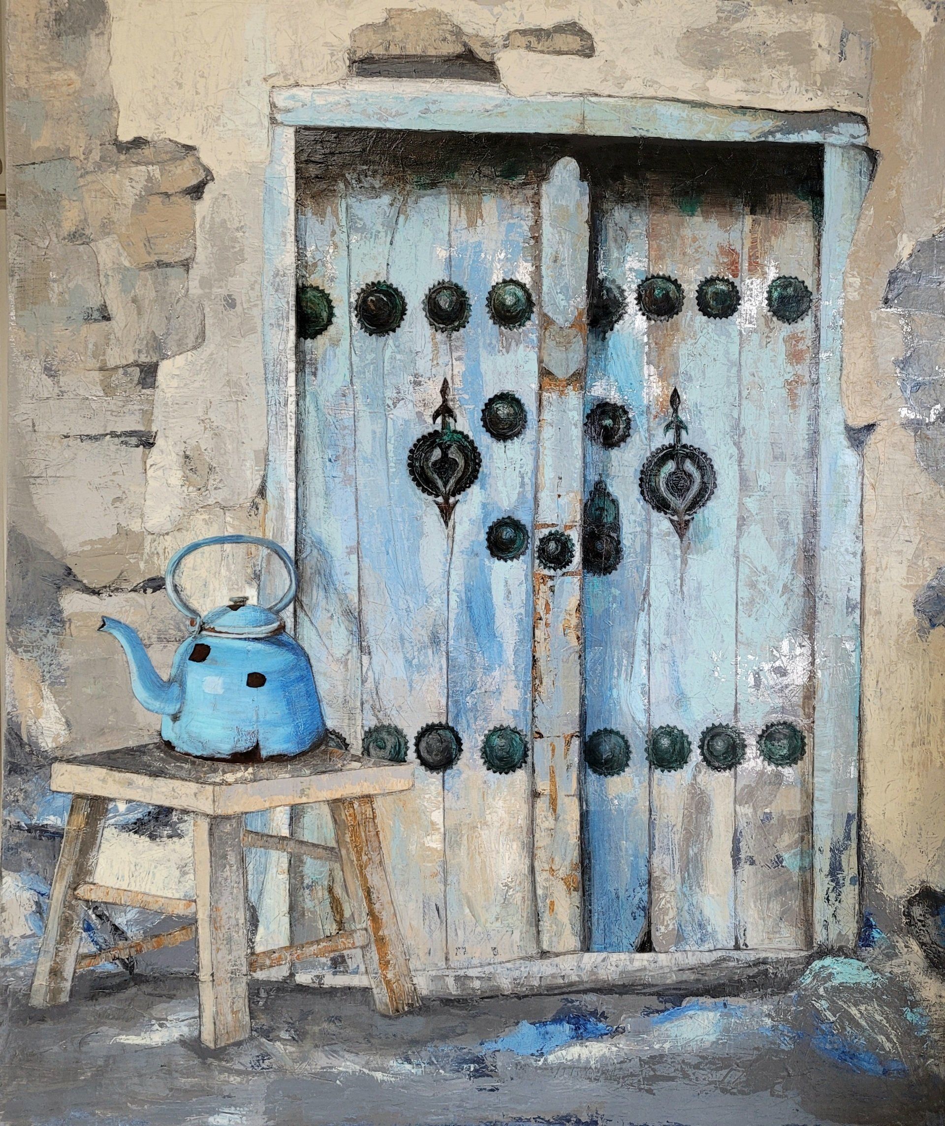 Shalini Bharadwaj, The Pale Blue Door - I find old doors very interesting subjects to paint. For me doors symbolise hope, opportunity, protection, new possibilities and mystery. As an artist I find the intriguing duality of what lies beyond or what lies within fascinating. For me, capturing the character and personality of an old weather-beaten door is similar to portraiture. Every scar, scrape, groove and ornament provide endless opportunity for visual story telling. I work from photographs I have taken on my travels as well as collected from other sources over the years. I use a mix of acrylic paint, liquid charcoal, graphite pencil and high pigment inks to create textural layering in my paintings.