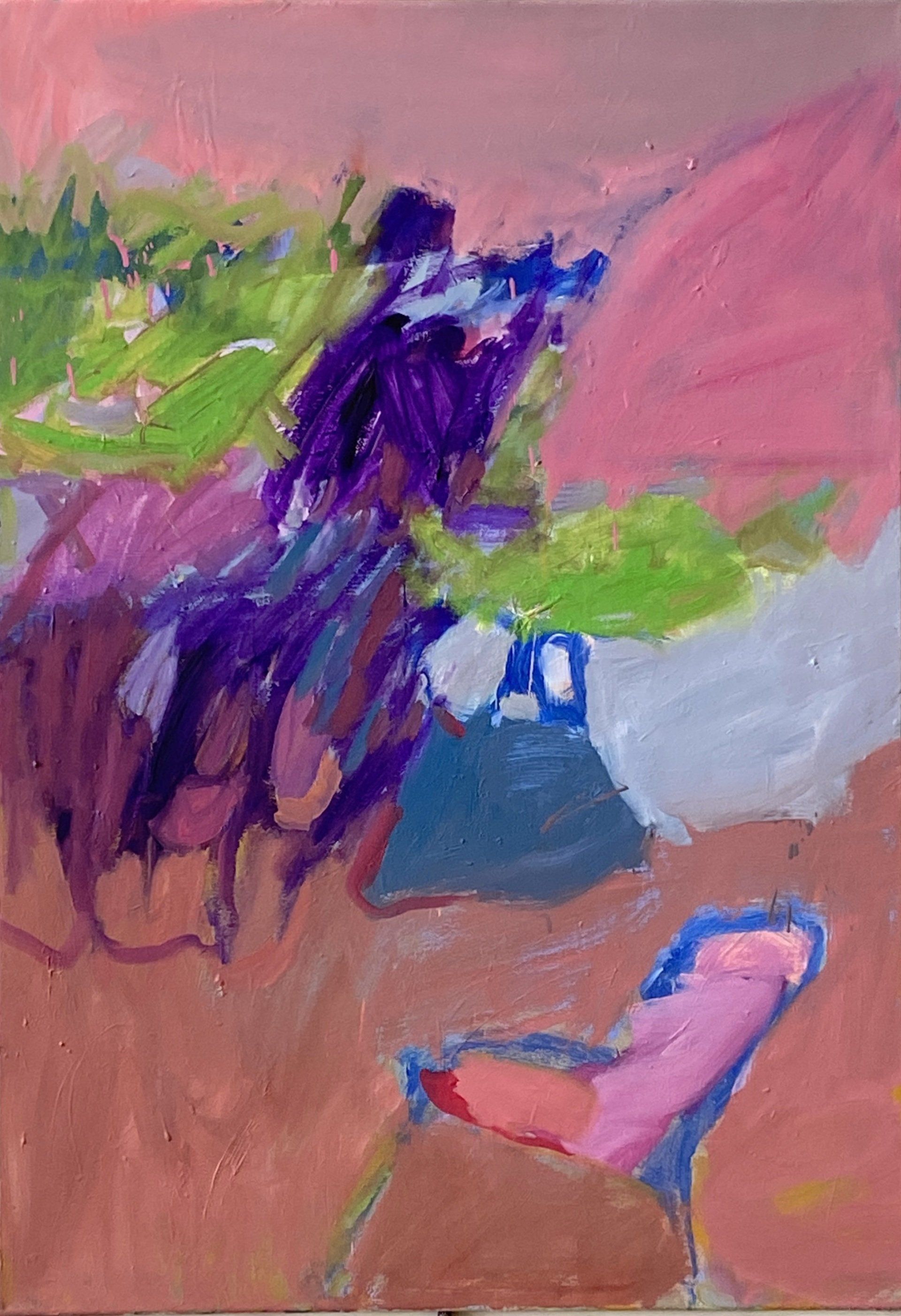 Petra Schott, Garden of longings I - An empty chair somewhere in the middle of nowhere. In the background a garden is visible, perhaps with human beings moving there. Together with the title we understand the painting is more about inner visions than outer reality. The strong oil colours underline an intense imagination and longing for something not available for the time being.