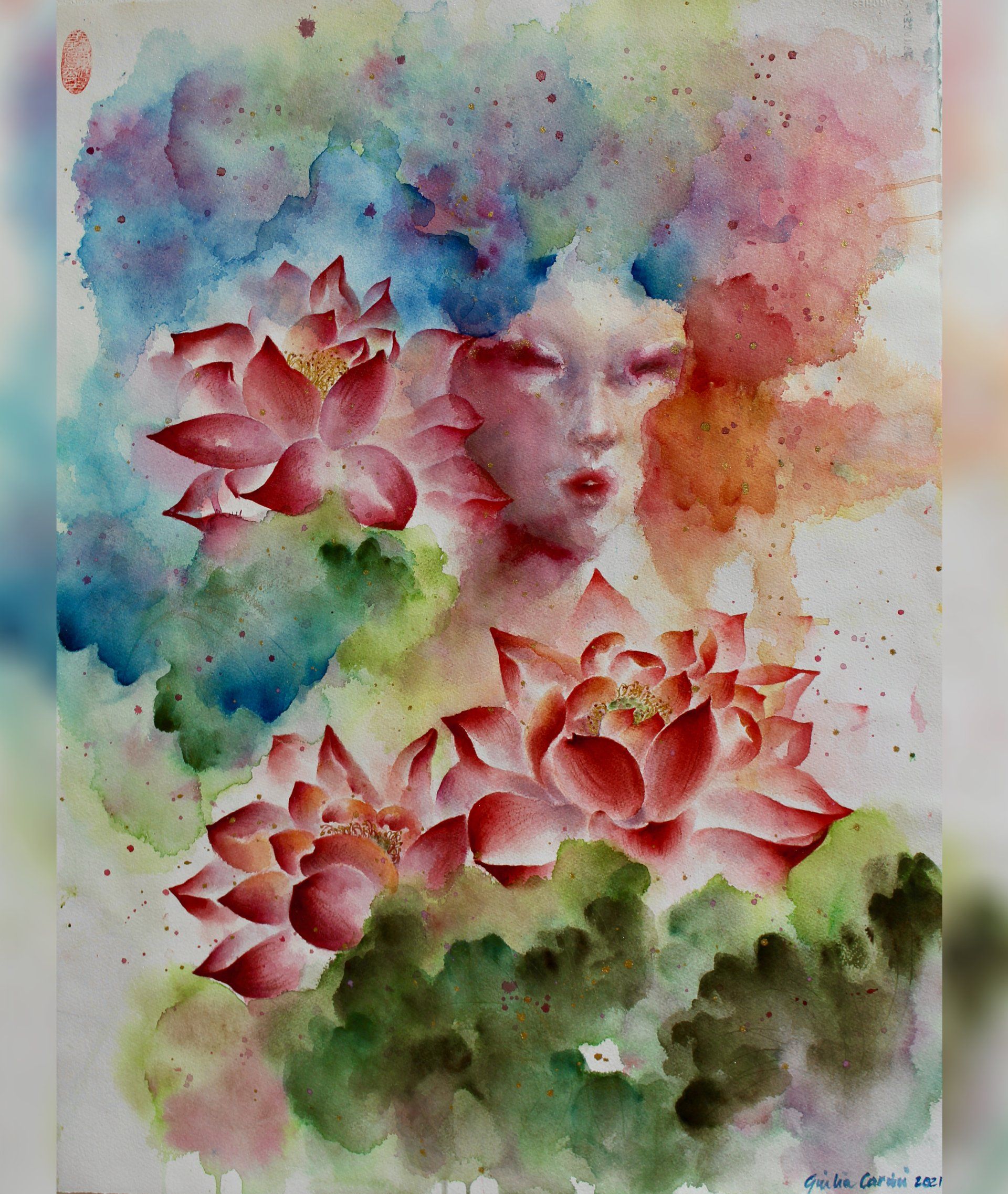 Giulia Carini, Peaceful Energy - In these last years, during my travels in Asia, I realized I was very attracted to Buddhism and its philosophical principles. One of the symbols of Buddhist religion is the Lotus flower whose meaning is related to purity, enlightenment, and spiritual awakening. Also in meditation and Yoga the Seven Chakras or Wheel of Light are depicted in the form of a lotus which absorb and transmit universal energy in and out of the body. In my watercolour “Peaceful Energy”, I imagine a flow of energy moving between the flowers and the girl. This silent force embraces them with an aura of balance and tranquillity.