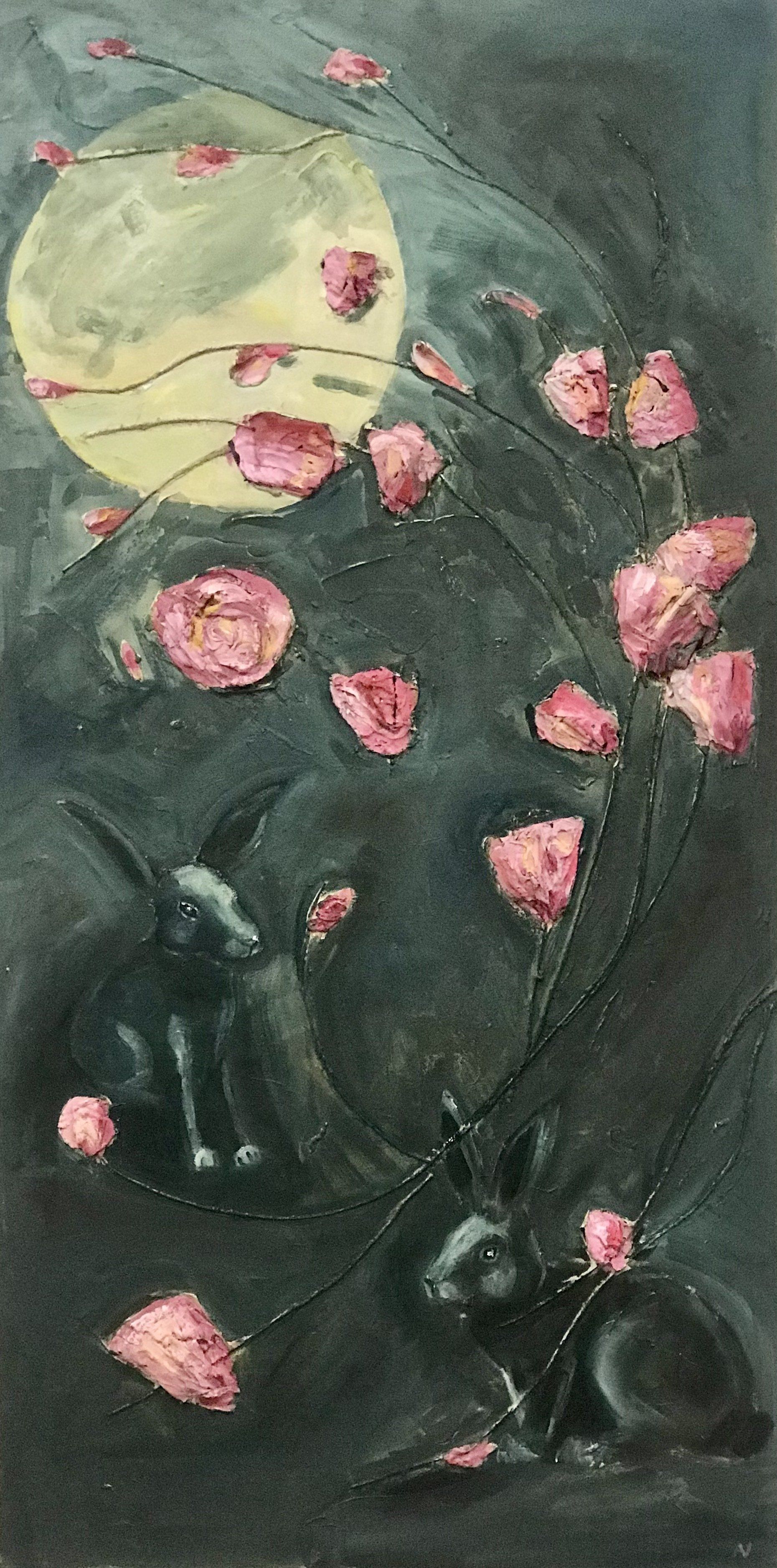 Artist Alenka Vrhovnik Tezak in art Art Vivianne, Secret Garden in Moonlight - The same perception of grace and elegance is perceivable in “Secret Garden in Moonlight” where two rabbits and full moon give the mysterious tone and lead the viewers to Alice in the Wonderland inherent with the artist’s aim of a free interpretation and imagination of the subject, immersed in her thoughts, as the Romantic souls are.