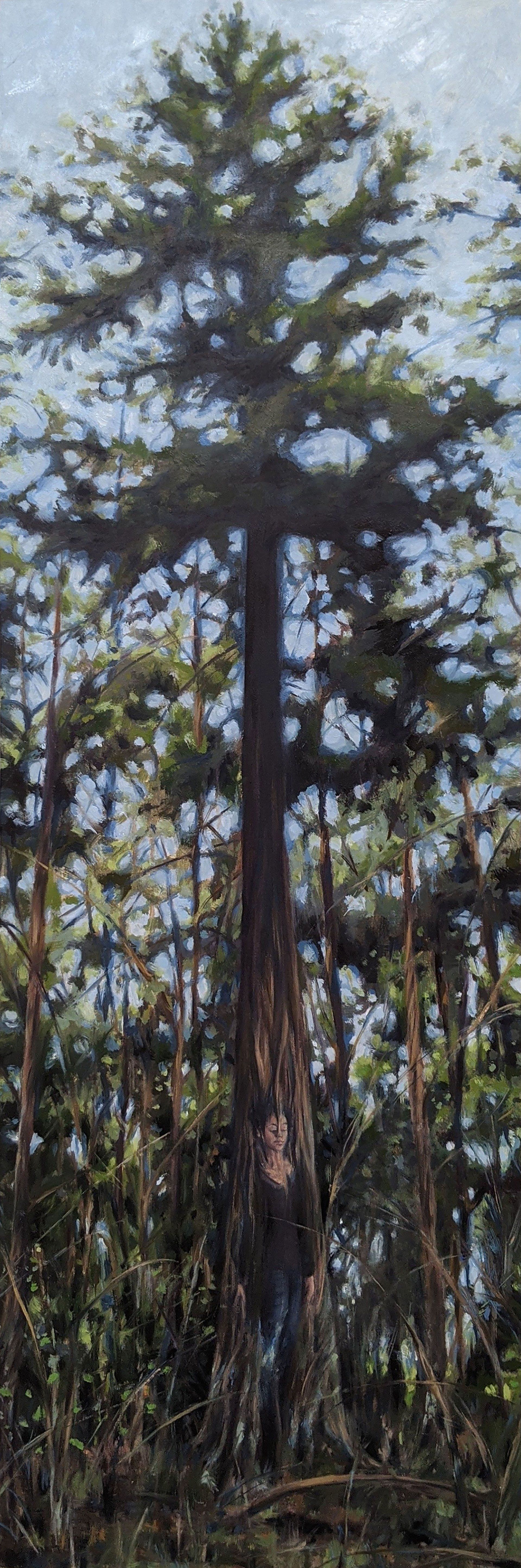 Shelby K Cook, Old Growth - This piece is exploring my own love of forests and an aspect of the relationship between humans and nature. A fading self-portrait blends in with the trunk of an old tree, showing my personal connection with trees as well as acting as a metaphor for the human race as a whole, showing that we are a part of nature, despite the often contentious relationship that humans have with the environment.