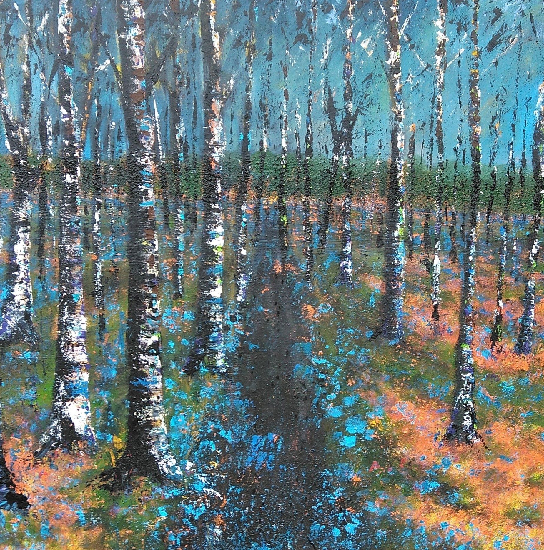 through it all. This painting captures all the beauty of a wood scene with Summer Flowers in bloom. The impressionistic layers capture the movement and utter beauty of the scene. ‘Bluebells and Sunrise’ is an original acrylic painting, created on deep-depth canvas 100cmx100cm. The painting was created in Darren’s Open Impressionism style, with a background of brush strokes then thick, layered detail using knives and a very limited palette.