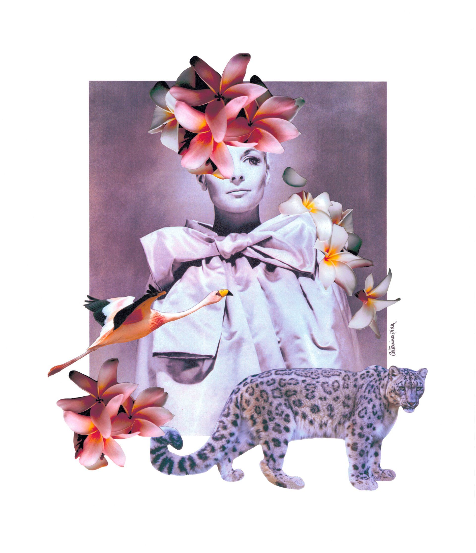 Catarina Diaz, Reverie - I consider my art a way to celebrate life. Reverie depicts a retro fashion image superimposed with flowers and wild animals. The strategic placement of the flowers imitating the details of the dress enhance the visual aesthetic. The snow leopard on the lower right serves as a symbol of inner instincts and intuition, and the flamingo taking flight speaks to the balance, beauty, and grace of both the figure and composition. The work embodies the meaning of the title, daydreaming and losing yourself to one’s thoughts. The whites, light pinks, and darker purple hues enhance the dreamlike characteristics of the composition. Furthermore, the juxtaposition of soft and bright colours creates an idyllic scene.