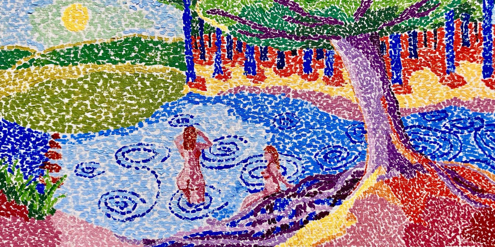 Ella Jackson, Skinny Dip - Inspired everyday by the women around me, my works commemorate the close relationships of females and the idea of sisterhood. Through the restrictions in travel that came with the pandemic, seeing friends and family became limited, forcing us to communicate through a screen. The subjects in my works emit a sense of togetherness as well as nostalgia of the past but also hope for the future. I am also interested in our connection more broadly, about being women and the importance of having a close-knit group of females. I ultimately intend for my subjects to portray a sense of freedom and togetherness, as a form of escapism from current circumstances.