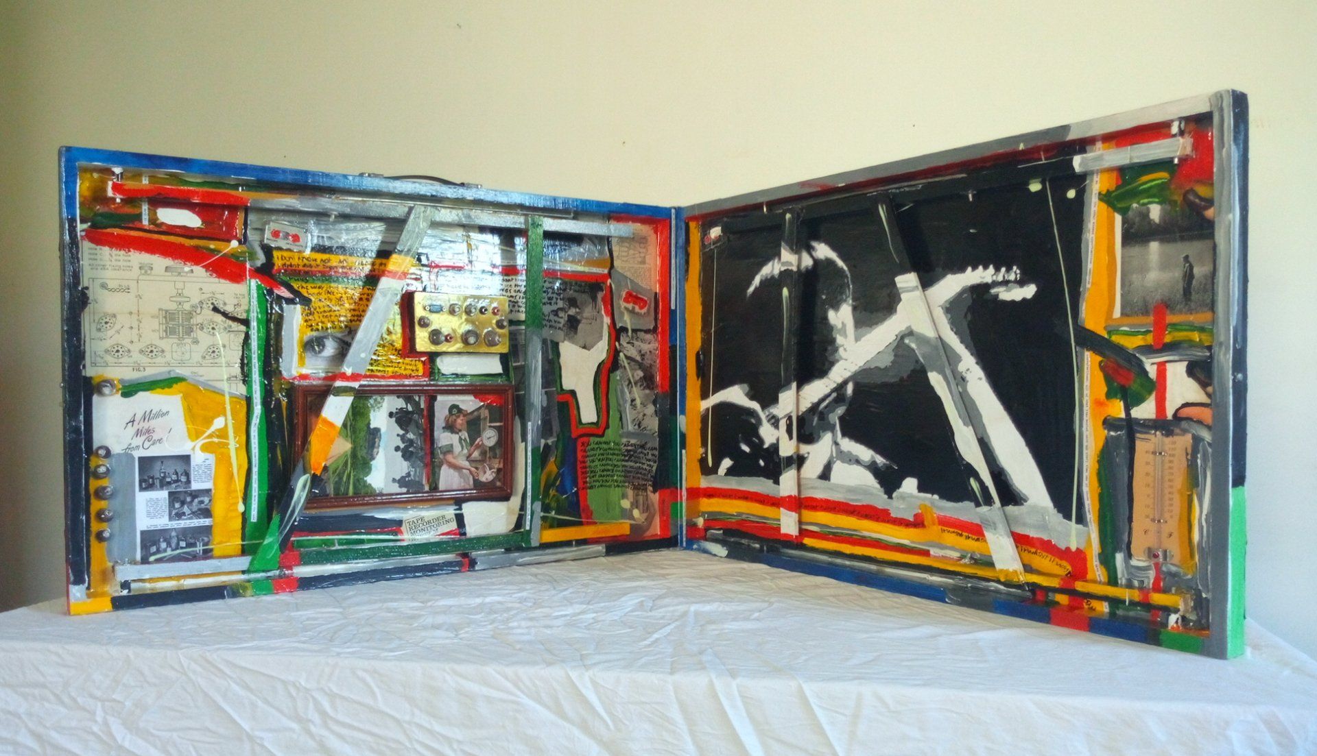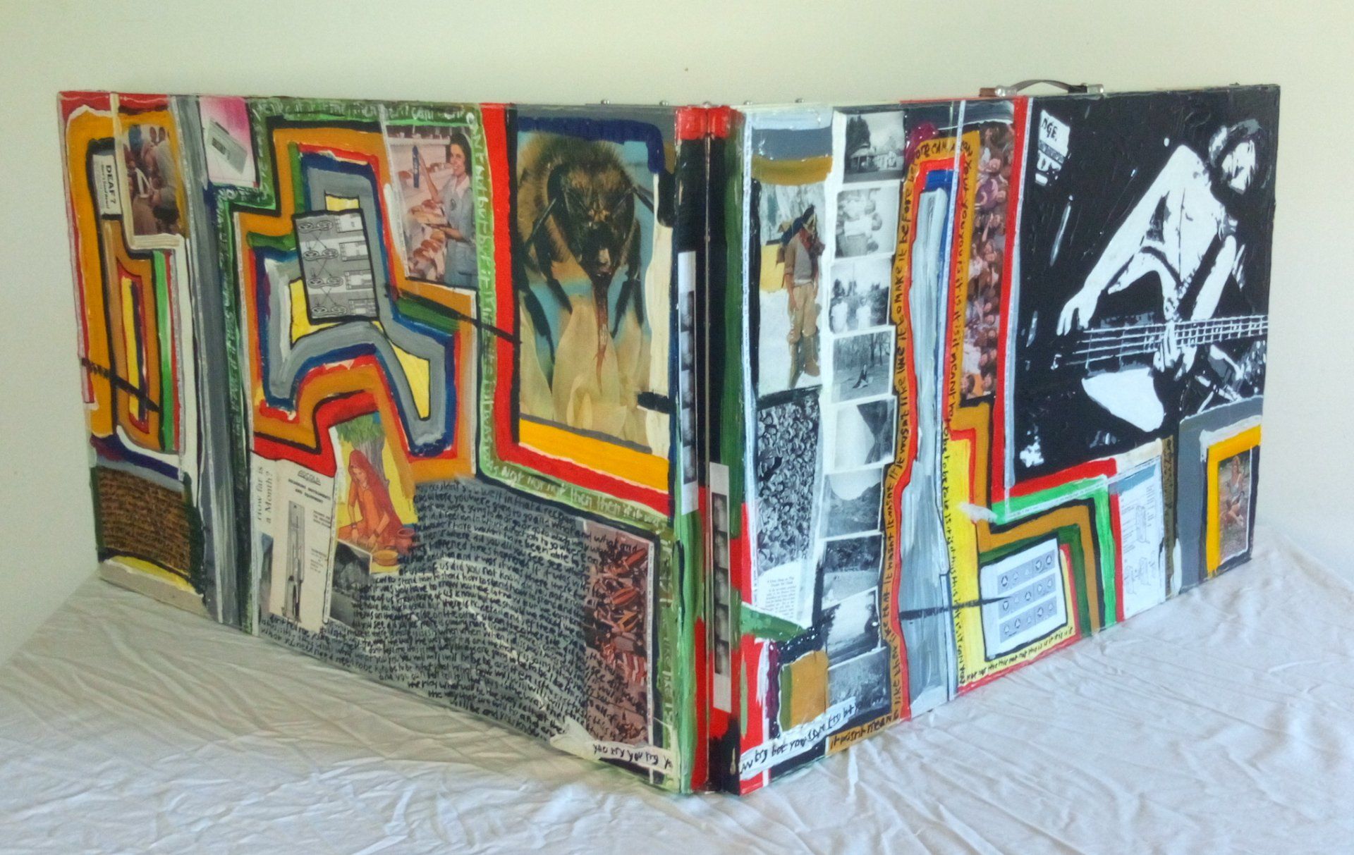 Andrew Rowe, Isolation Corona Table To Make Time Pass - This was made at the start of the coronavirus lockdown. I found myself with protracted amounts of time to consider my surroundings and started to explore their potential to create artworks in various media that I ordinarily would not have considered. I was unable to venture outside and to pass the time I created physical collage pieces using items immediately to hand and the first item I used was an old pasting table. I used found objects, images, acrylic paint and varnish and chose them primarily for their aesthetic qualities and only started to appreciate their ideas and context when the piece was finished and I gave myself time to further contemplate the piece as a whole.