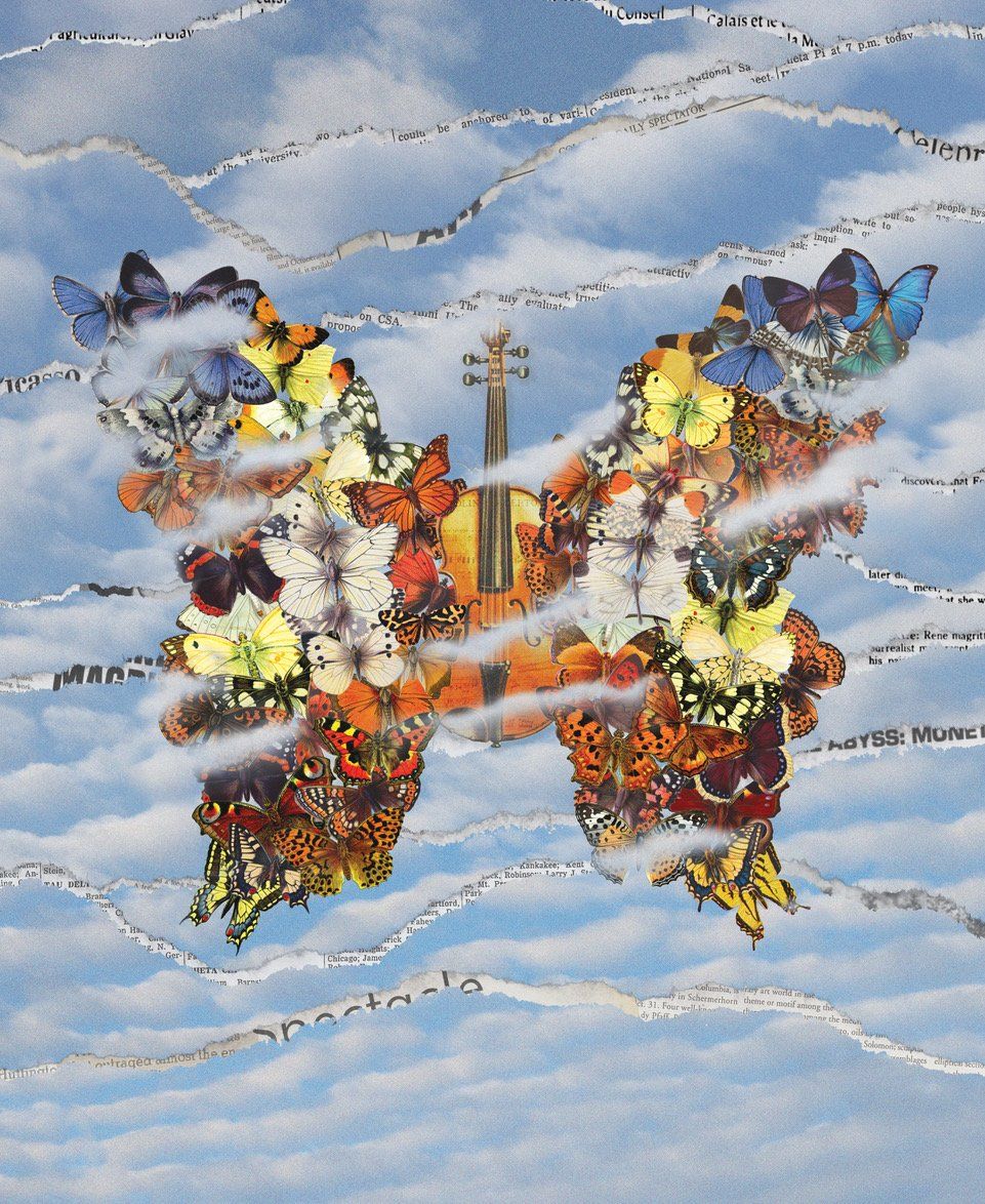 Benny Warsh, Outspoken - Outspoken is a reminder of those creative giants of the past whose visions broke through the status quo of their time. The inherent delicate nature of the violin and butterfly unite creating a familiar formation with an imprint of sheet music from the great composer Bela Bartok. Bartok refused to preform in Germany and fled Hungary during World War II. Dated newspaper articles featuring the achievements of Claude Monet, Pablo Picasso and Rene Magritte break through the clouds presenting organic colours above. The link between butterflies and growth can be cliché but when viewing this piece distance any contemplation away from the individual. Imagine all of the colour in the world that appeared from just an idea.