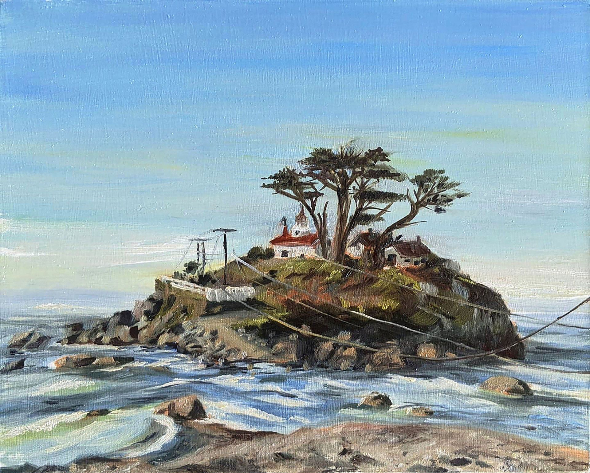 Shelby K Cook, Battery Point Light - Painted en plein air in Crescent City, CA, this piece is an attempt to capture the nostalgia I feel viewing the scene as I remember the frequent stops made here on road trips from Washington to California with my father when I was younger. I always loved the way the tide blocks the lighthouse from access, stranding anyone on the island, even as electricity still spans the gap and connects the seemingly lone lighthouse with civilization.