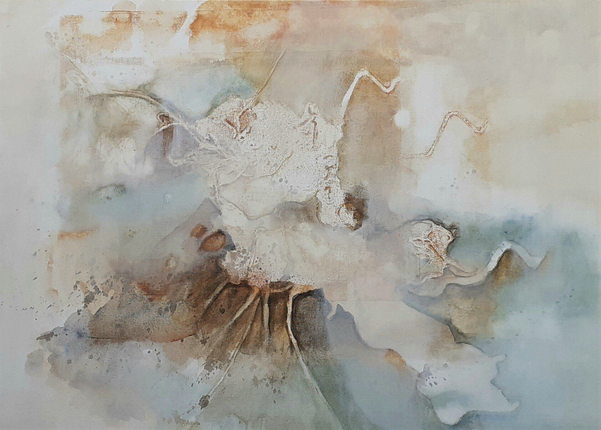 Geraldine Leahy, Mutation - Currently, I am looking at the effects of coastal erosion in my locality. My approach involves using debris, such as plastic, in layered processes that reflect changes in the environment. Mutation began as a monoprint of plastic strands found on the beach. I explore the incongruity of this manmade material which can create quite beautiful images in monoprinted form, yet is deadly to marine life. In Mutation, the plastic, which originally created an attractive composition on the canvas board, has changed into something more sinister with the addition of layers of paint and gouache. Areas of paint have been washed away, which references erosive activity.