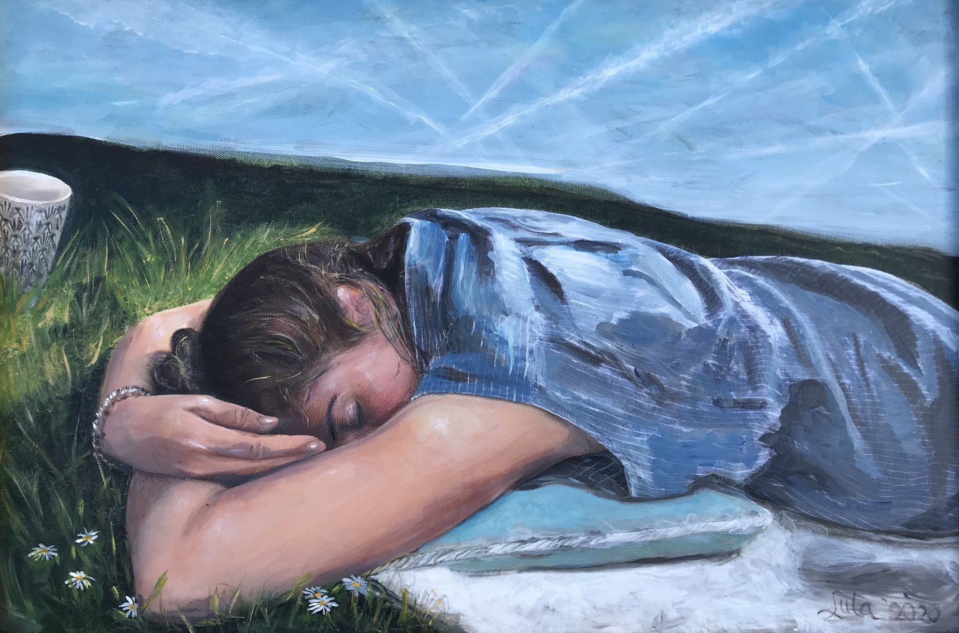Louise Hynes, Asleep - Asleep is a painting using acrylics on a recycled canvas. 45cms high x 65cms wide, framed. It shows a girl ( my daughter) sleeping on the grass along our Kent cliffside on a hot day, her face getting very pink, her mug of tea left to one side. In the blue sky there are condensation trails from aircraft crisscrossing the sky, or are they chemtrails polluting our world ? We decide what we believe about this controversial subject. Either way, her sleep makes her oblivious to all around her. Bliss.