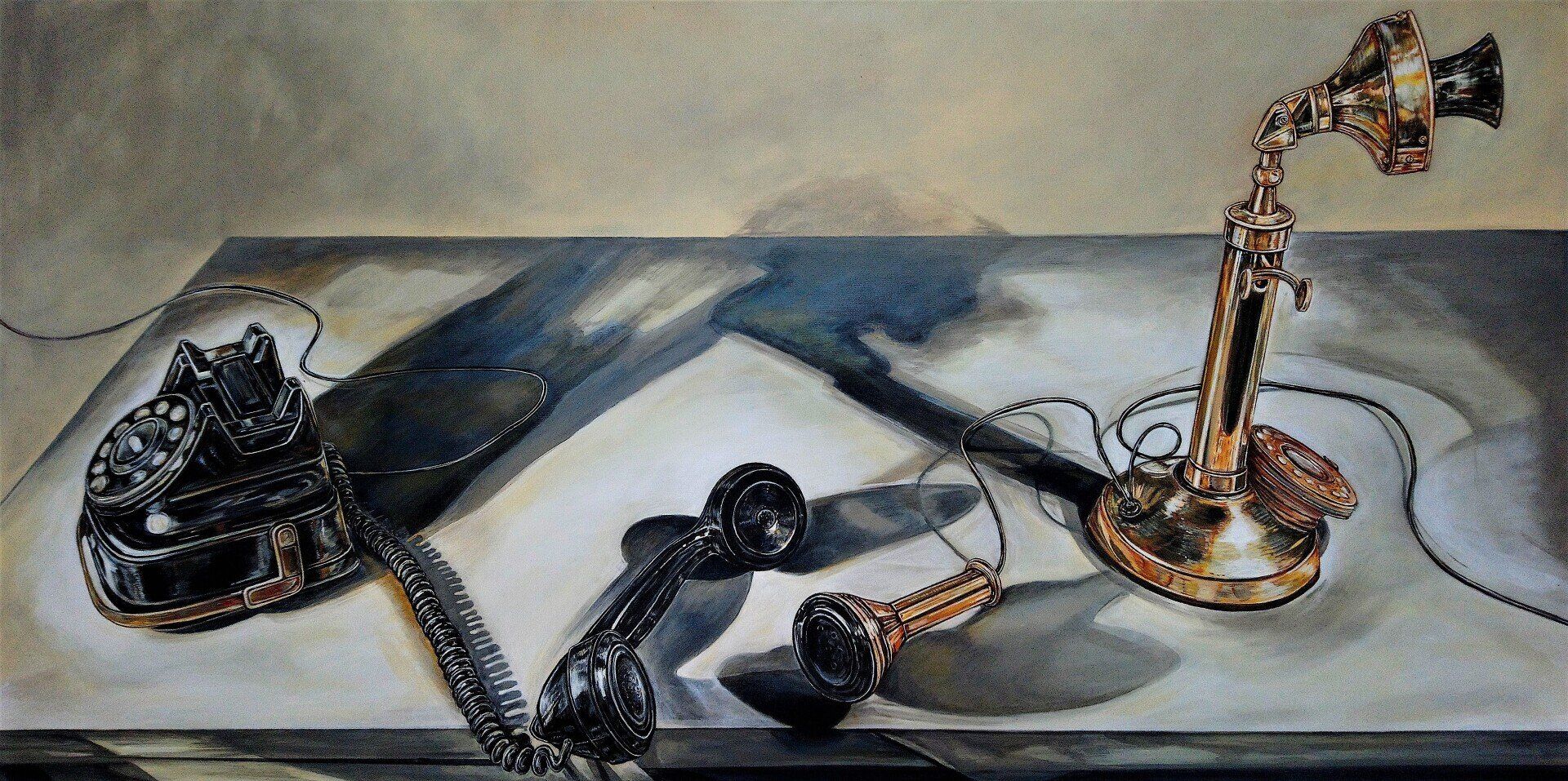 Matt Noir, Conversation Piece No.19 - My paintings explore the symbolic power of the object, how they are bestowed with meaning, evoke memory and develop narrative. I am particularly interested in devices of communication and the connections that are derived through the viewer’s relationship to them; as well as the objects having their own relationships. All of this strengthens the dialogue between the objects and the onlooker to create a conversation. I have revisited my paintings to see how they have taken on new meanings in light of events of the times. Not only are ‘we’ re-emerging and re-examining things anew, so too is art being re-seen in a different context.