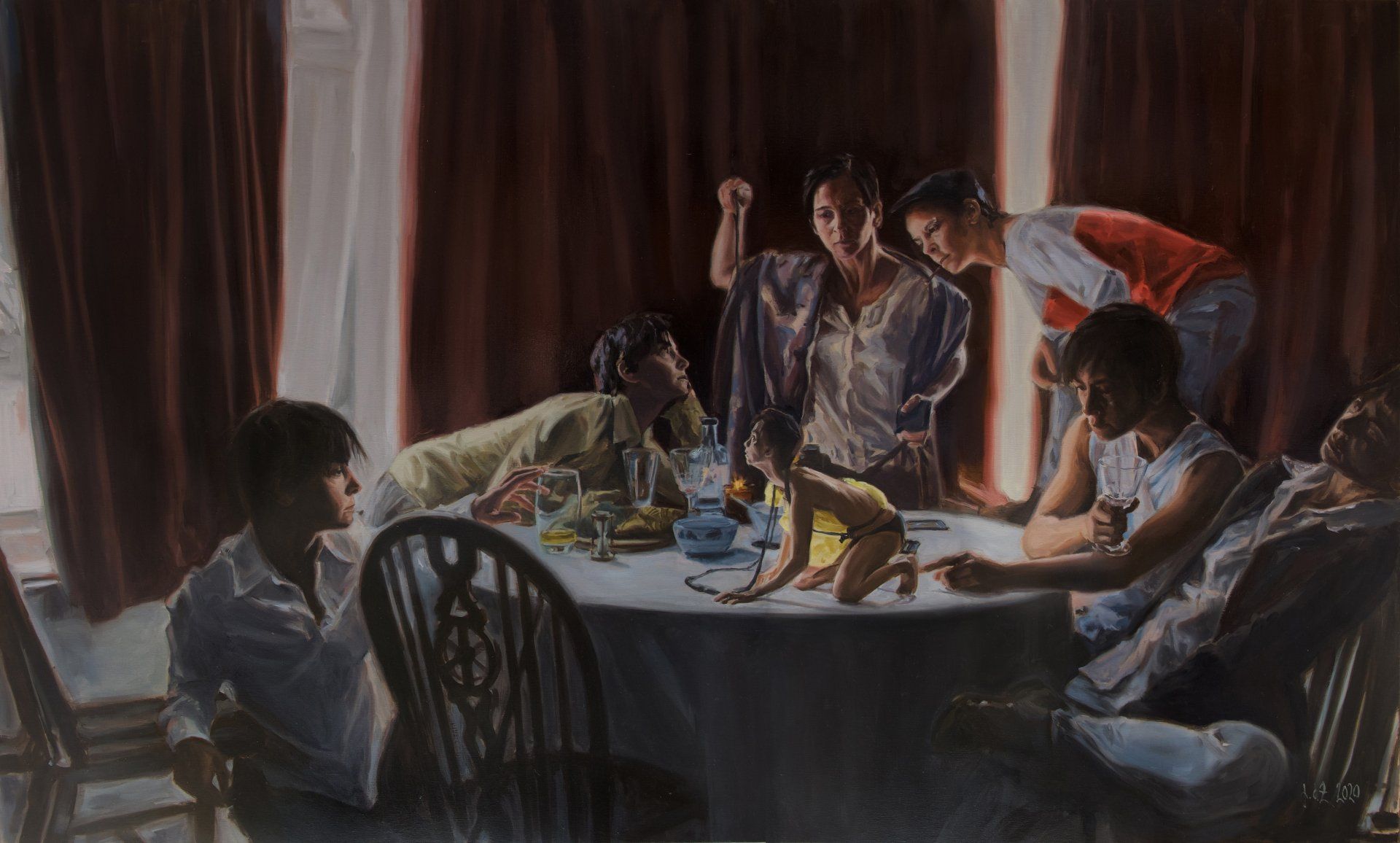 Jess de Zilva, One of those days - Jess de Zilva paints psychological allegories. Her work ‘One of those days’ is inspired by Valentine de Boulogne’s ‘Last Supper’ and was originally going to portray ‘the morning after’ the party. As the pandemic hit and work with models wasn’t possible, she took on the roles of all the protagonists herself. The result being the painting having turned inwards, asking how we handle being relentlessly faced with our own selves. It speaks of a breakdown of social norms, of behaviour otherwise not laid bare and thresholds being lowered. Many facets of our personality come out to play; the good, the bad and the ugly. One of those days is one of the many indistinguishable days stuck in four walls with our selves.