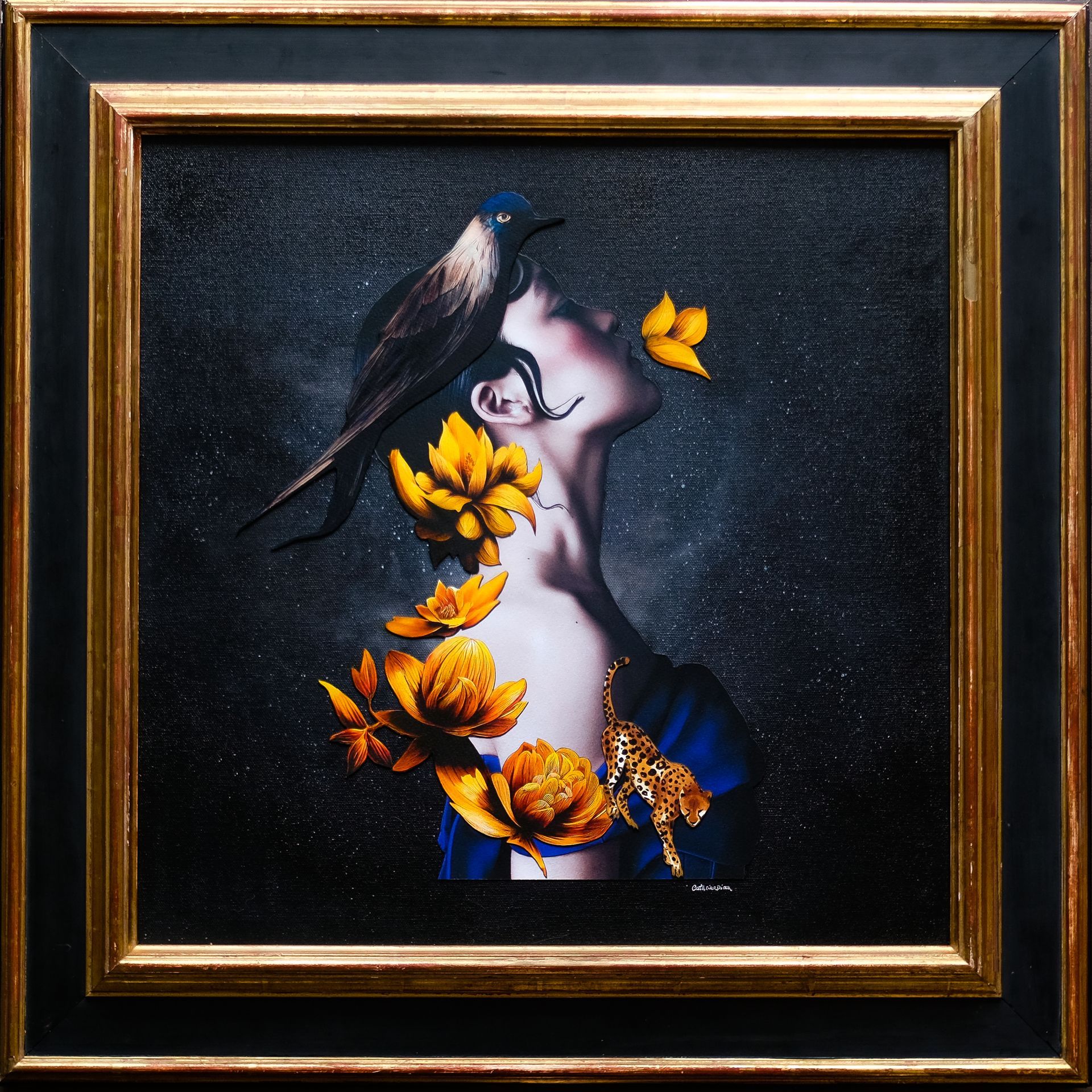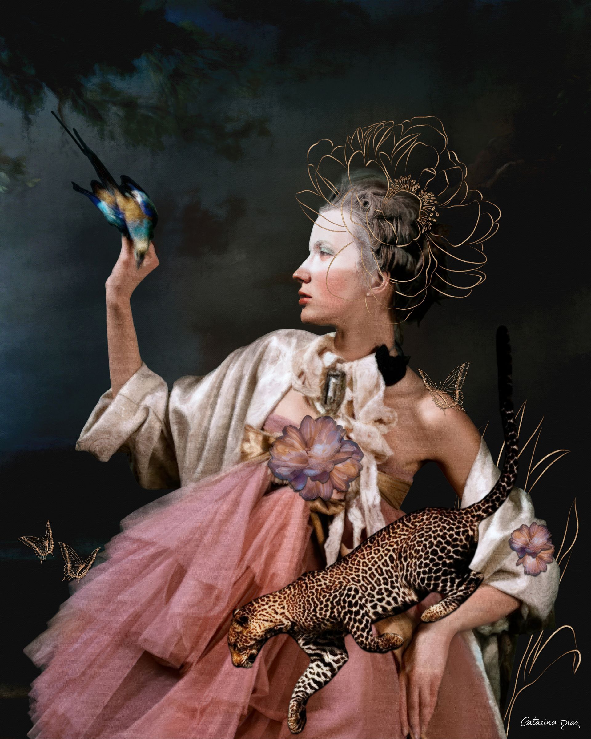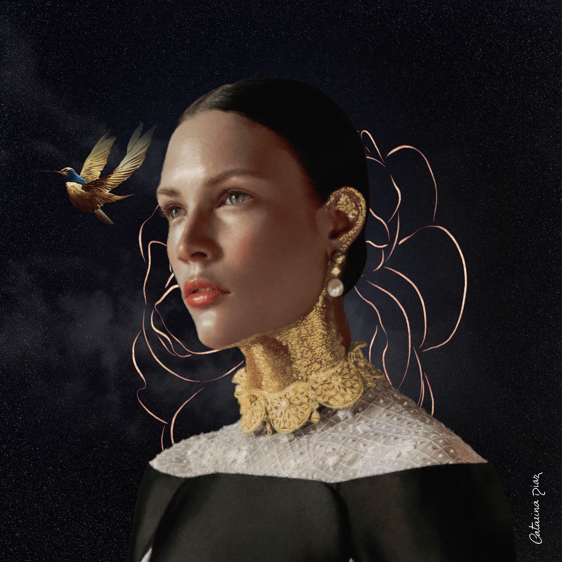 Catarina Diaz is a London-based artist who has become an established figure in the art world, having received multiple awards and recognition from the President of Portugal for her exceptional talent. Her work has been represented internationally in digital installations, exhibitions, museums, and art fairs, including prestigious venues such as the Saatchi Gallery, the Carrousel du Louvre in Paris, and various events across the world. It has also featured on television shows and in publications like Artist Talk Magazine, The Flux Review, and Vogue.