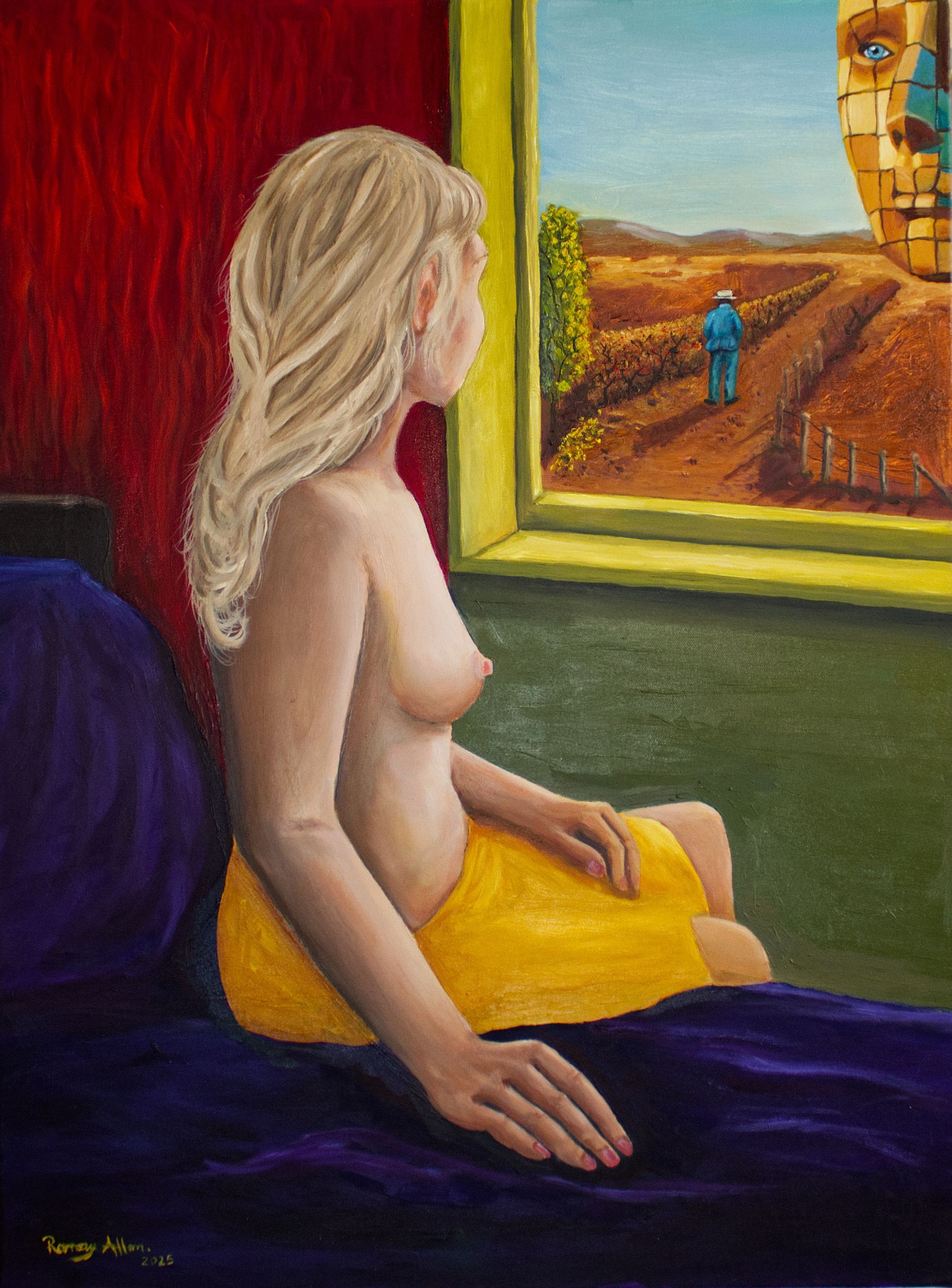 Continuing the series, this work deepens the exploration of psychological space. Light and distance create a sense of spiritual atmosphere, while the composition evokes the feeling of being between worlds — neither entirely physical nor entirely imagined. The painting reflects Allan’s ongoing investigation into how the mind constructs meaning through image and symbol.