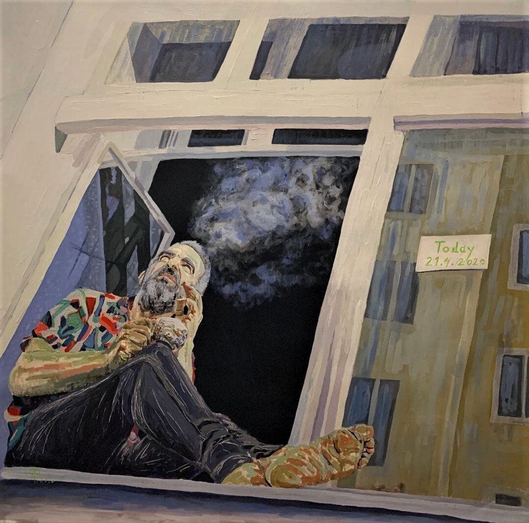 Thaer Maaroufs, Today is my birthday(21/4/2020) - I drew this painting on the first corona lockdown, and this coincided with my birthday as I could not invite anyone to celebrate! So, I drew myself while sitting at my studio window, smoking a cigarette and drinking coffee! Smoke heading inward indicates that pollution caused by humans falls in the beginning on the person himself! I later hung the painting from the outside on the same painted window in an attempt to say that art can continue even in difficult circumstances! The painting documents an ordinary day of a painter in his studio and a challenge to the lockdown.
