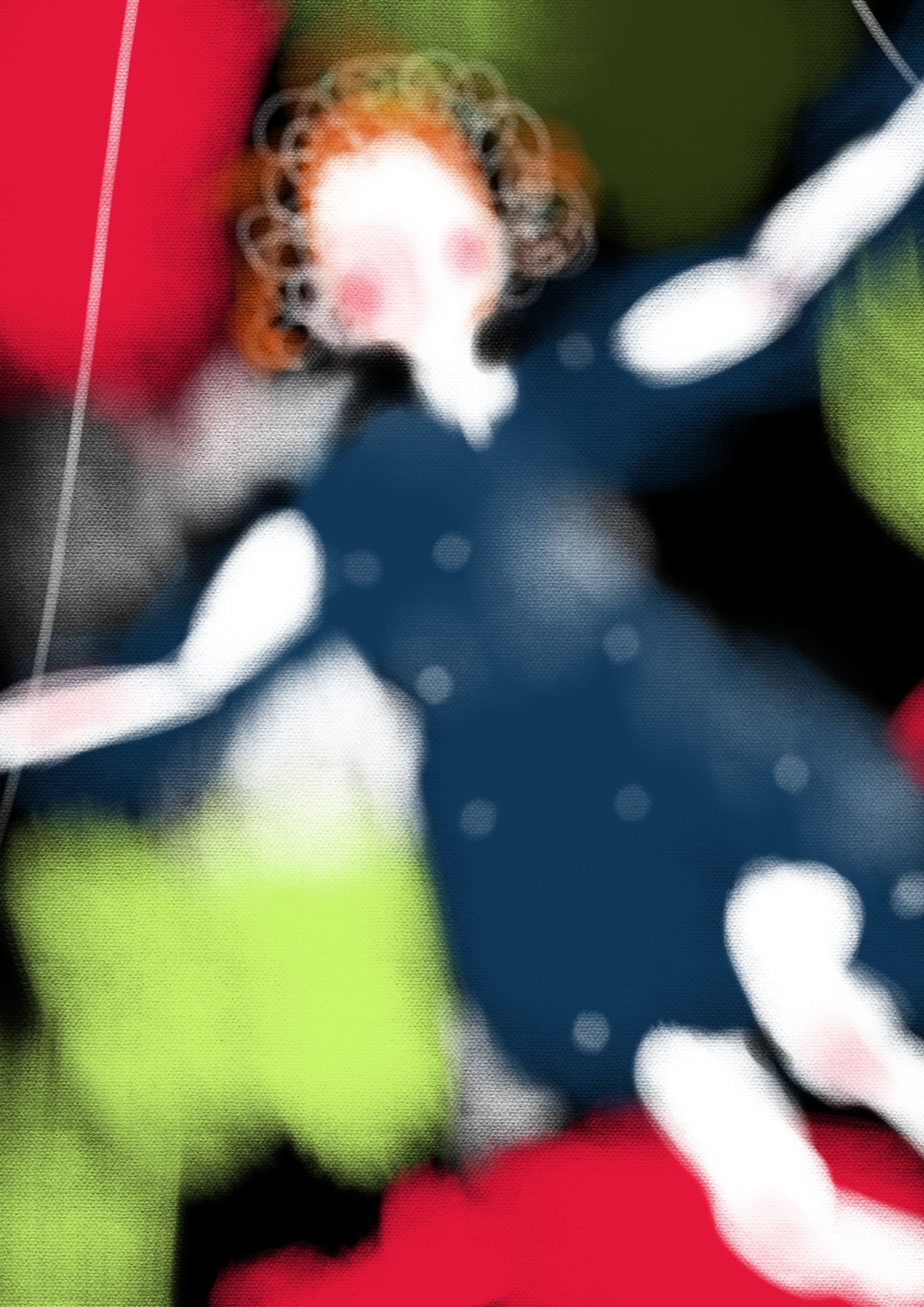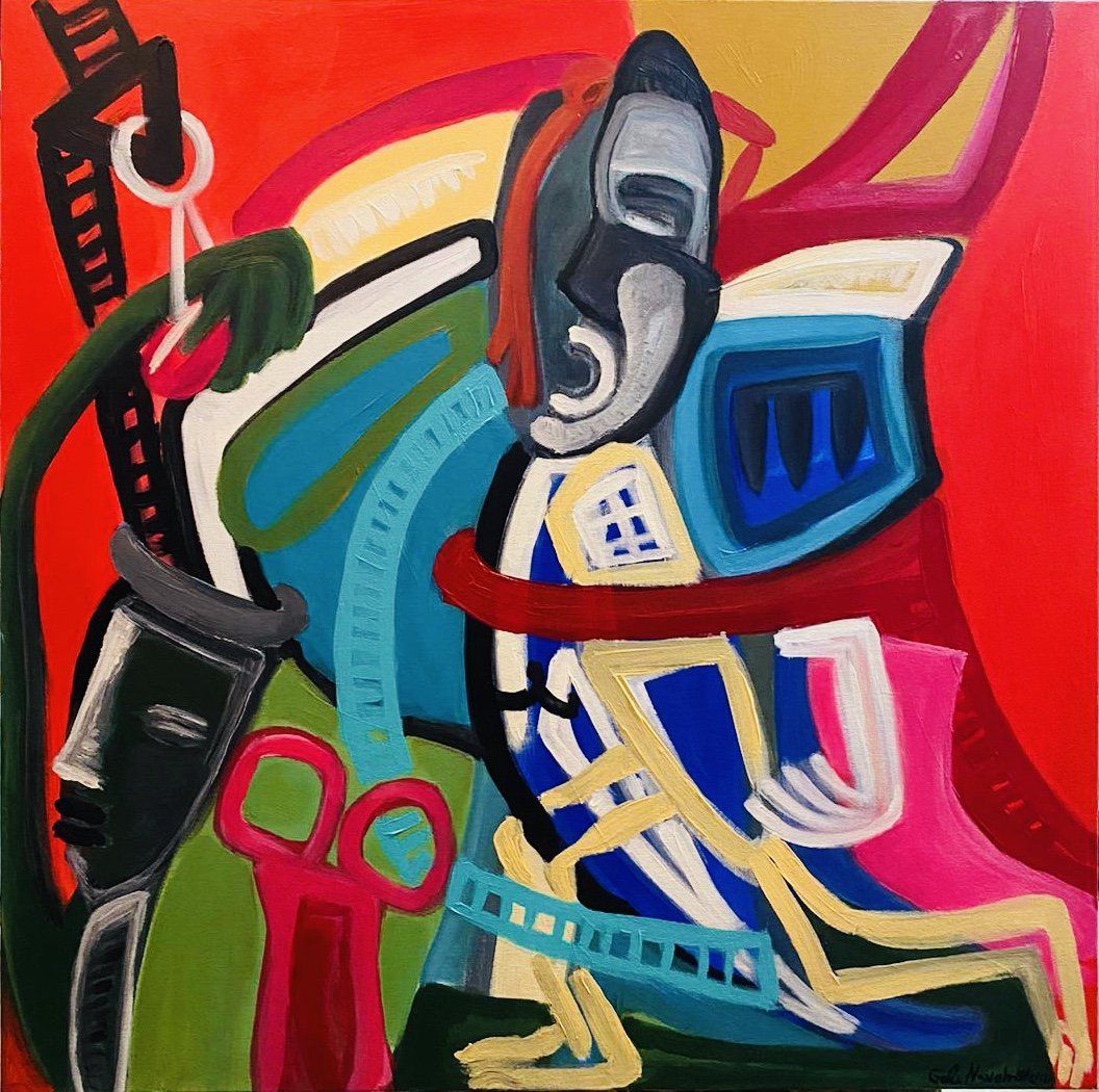 Gali Naveh-Stern, A Walk in the Park - created through Covid-19 reflects a mix of contrasting powers and components associated with this period. The arrogant king representing the virus, the doe like female figure in the center is expressing fragility and fear. The overall surrounding merge patterns of a park like setting representing happiness and freedom with contrasting items including strings, ladders and what may seem as a tied leg reflecting the chaos and constraints. The title - “a Walk in the Park” is also indicative of something that is easy to accomplish and stands in contrast to reality.