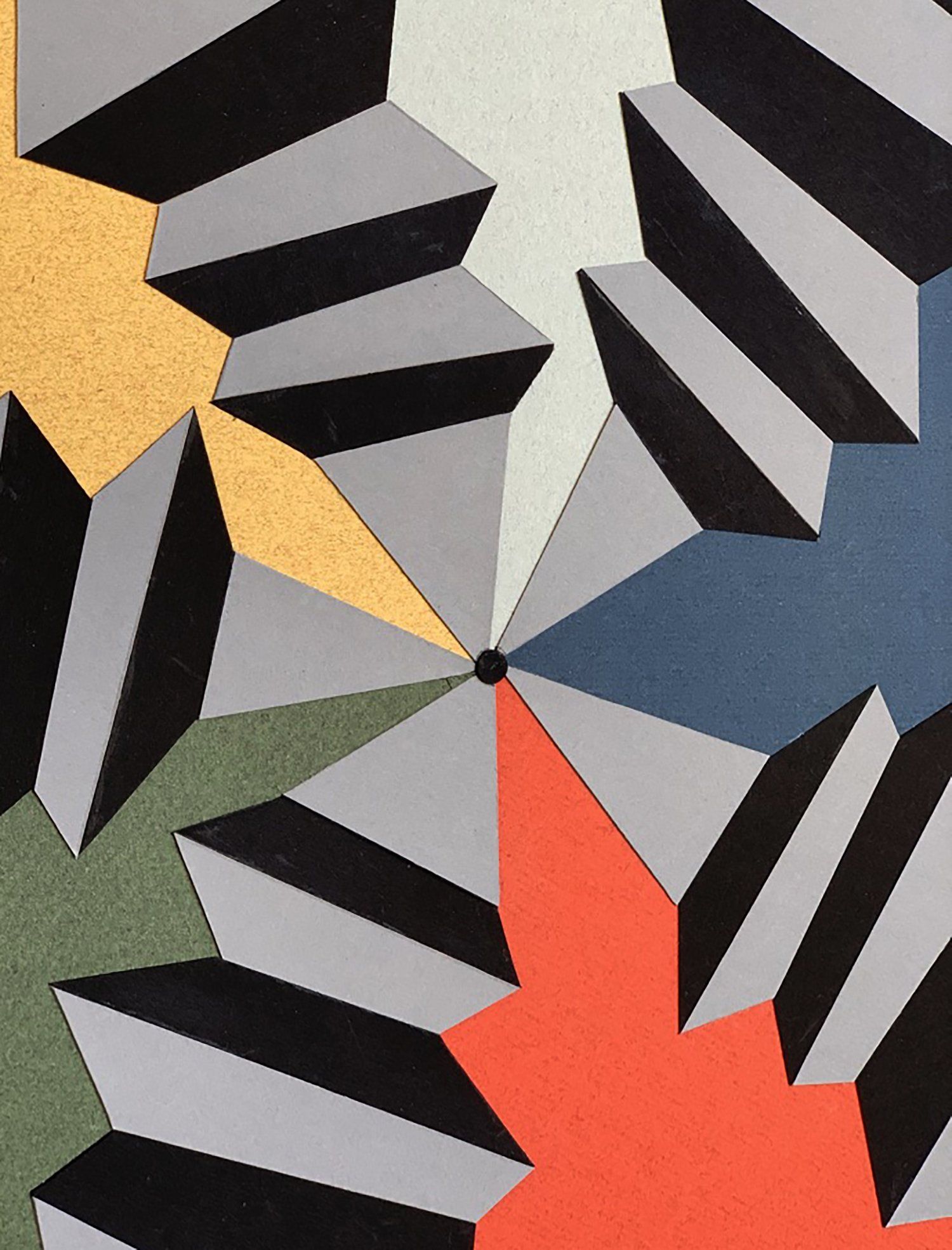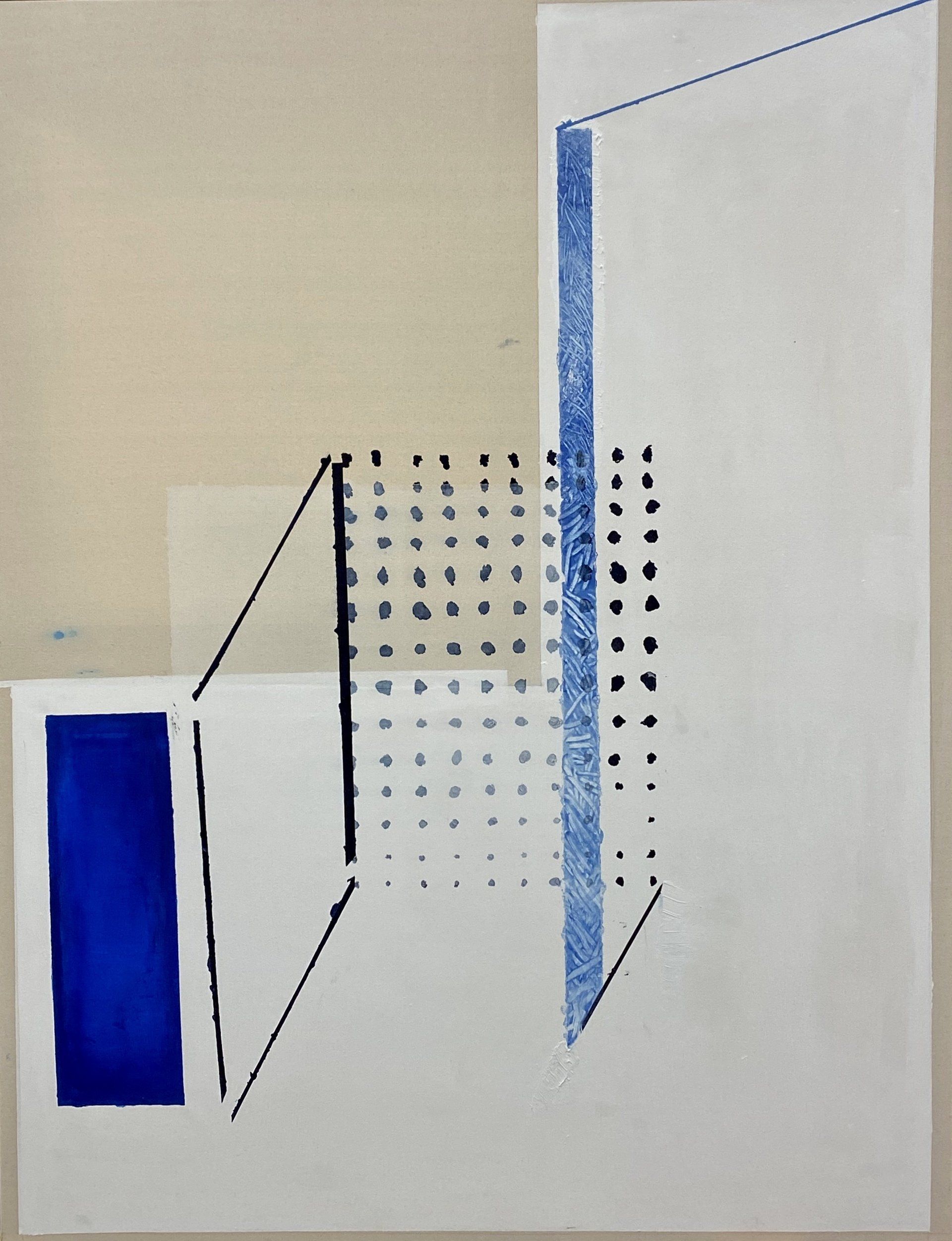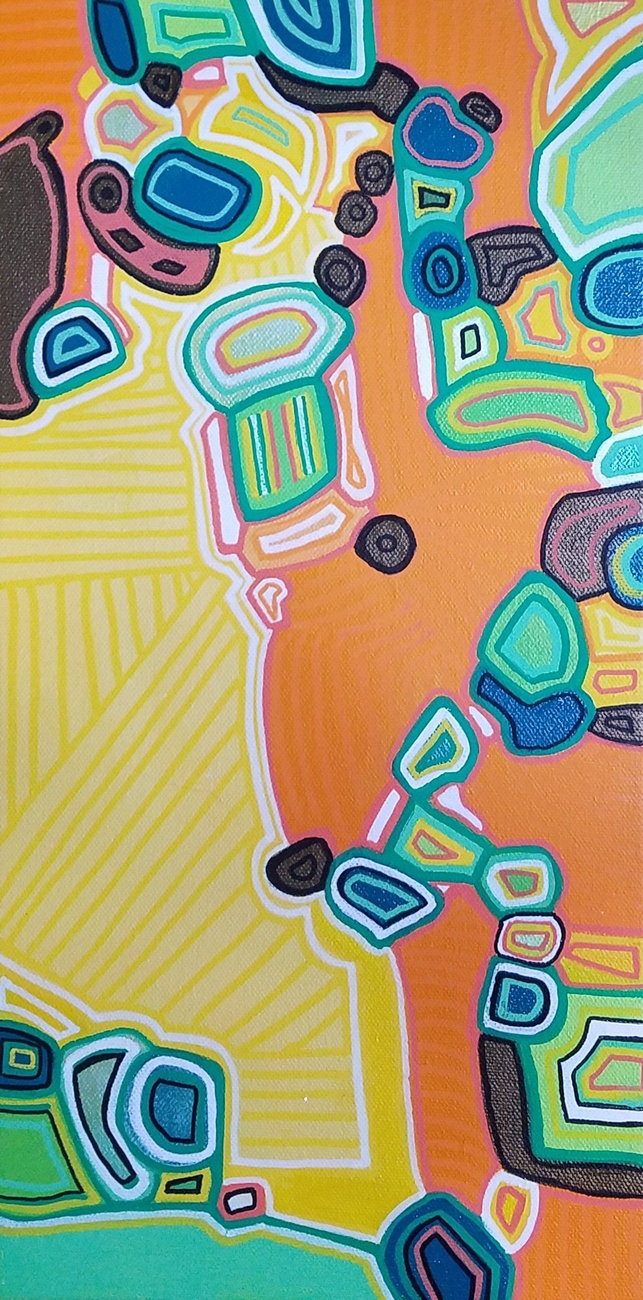 Kristin Ducharme, Emergence - I created ‘Emergence’ this past January 2021 in Brooklyn, NY from my kitchen table at home one night. This piece serves as an abstract expression of the isolation and repetition of our days through the year-long quarantine imposed by the COVID-19 pandemic. The patterns within the piece suggest forward movement, through repetition, ambiguously chasing a moving target seemingly out of the frame. The colors in the background are mildly cheerful and imply the possibility of a hopeful world surrounding our long days, just beyond our reach, but not out of our sight. Or perhaps one can see dancers on a stage, bent forward at the waist, frozen in place, before they begin. Something beautiful is about to happen.