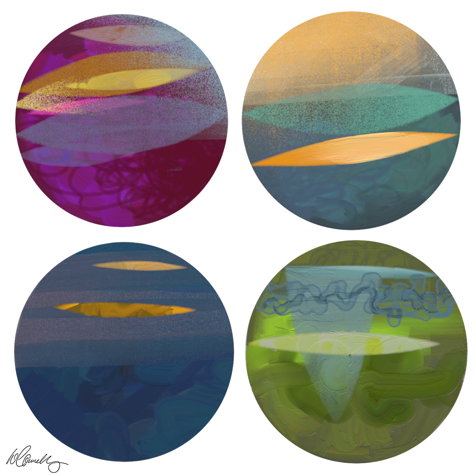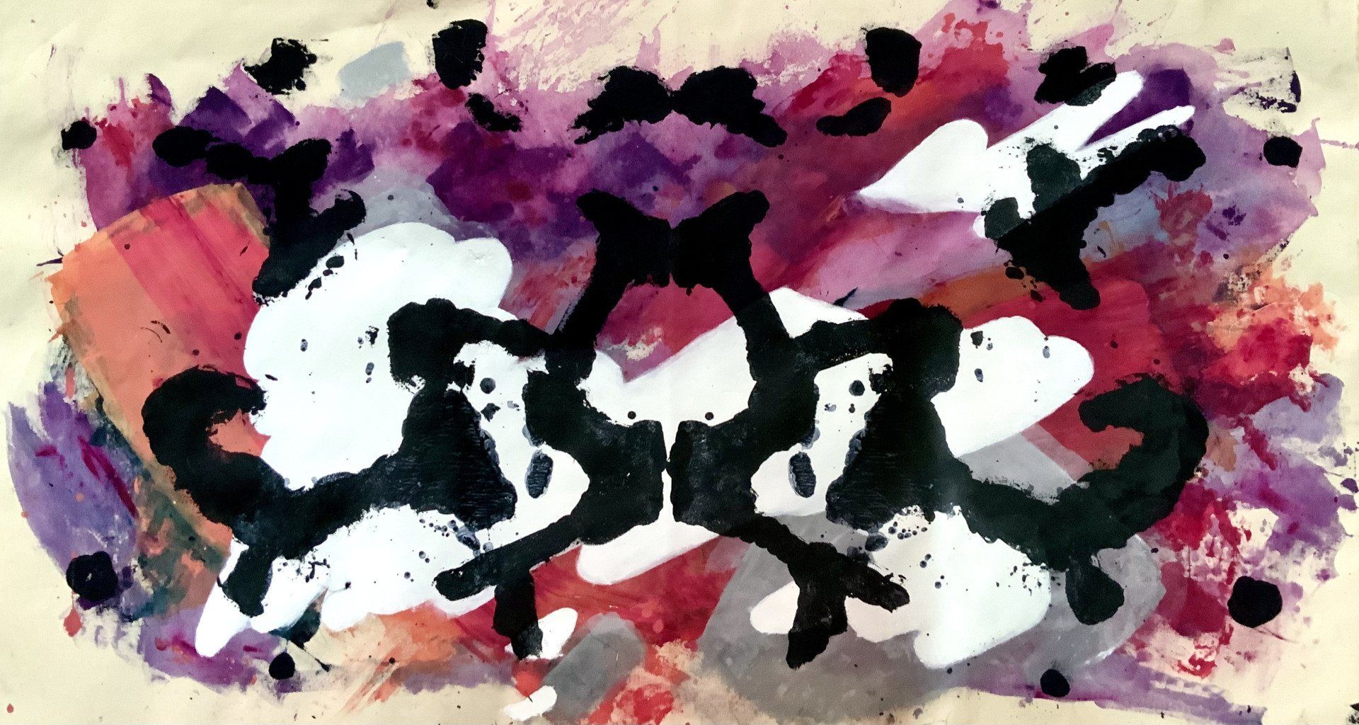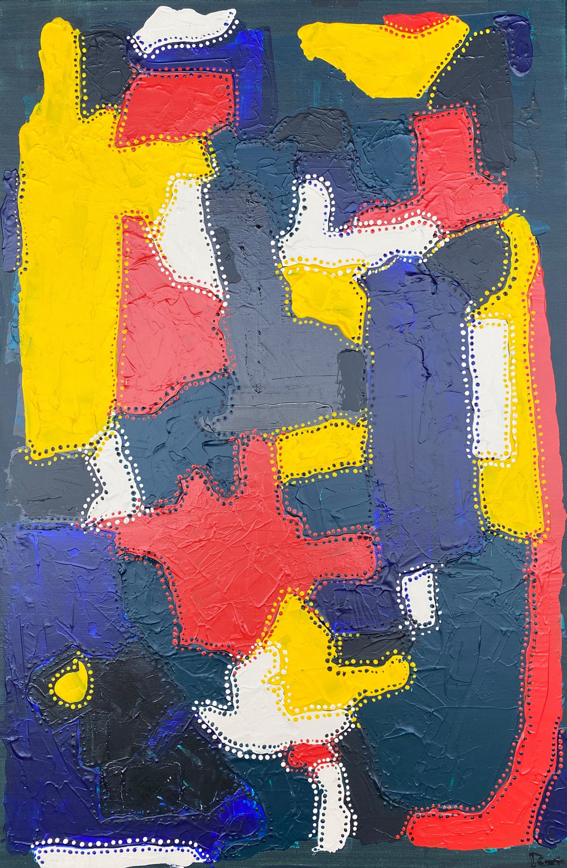 Kristin Ducharme, Emergence - I created ‘Emergence’ this past January 2021 in Brooklyn, NY from my kitchen table at home one night. This piece serves as an abstract expression of the isolation and repetition of our days through the year-long quarantine imposed by the COVID-19 pandemic. The patterns within the piece suggest forward movement, through repetition, ambiguously chasing a moving target seemingly out of the frame. The colors in the background are mildly cheerful and imply the possibility of a hopeful world surrounding our long days, just beyond our reach, but not out of our sight. Or perhaps one can see dancers on a stage, bent forward at the waist, frozen in place, before they begin. Something beautiful is about to happen.