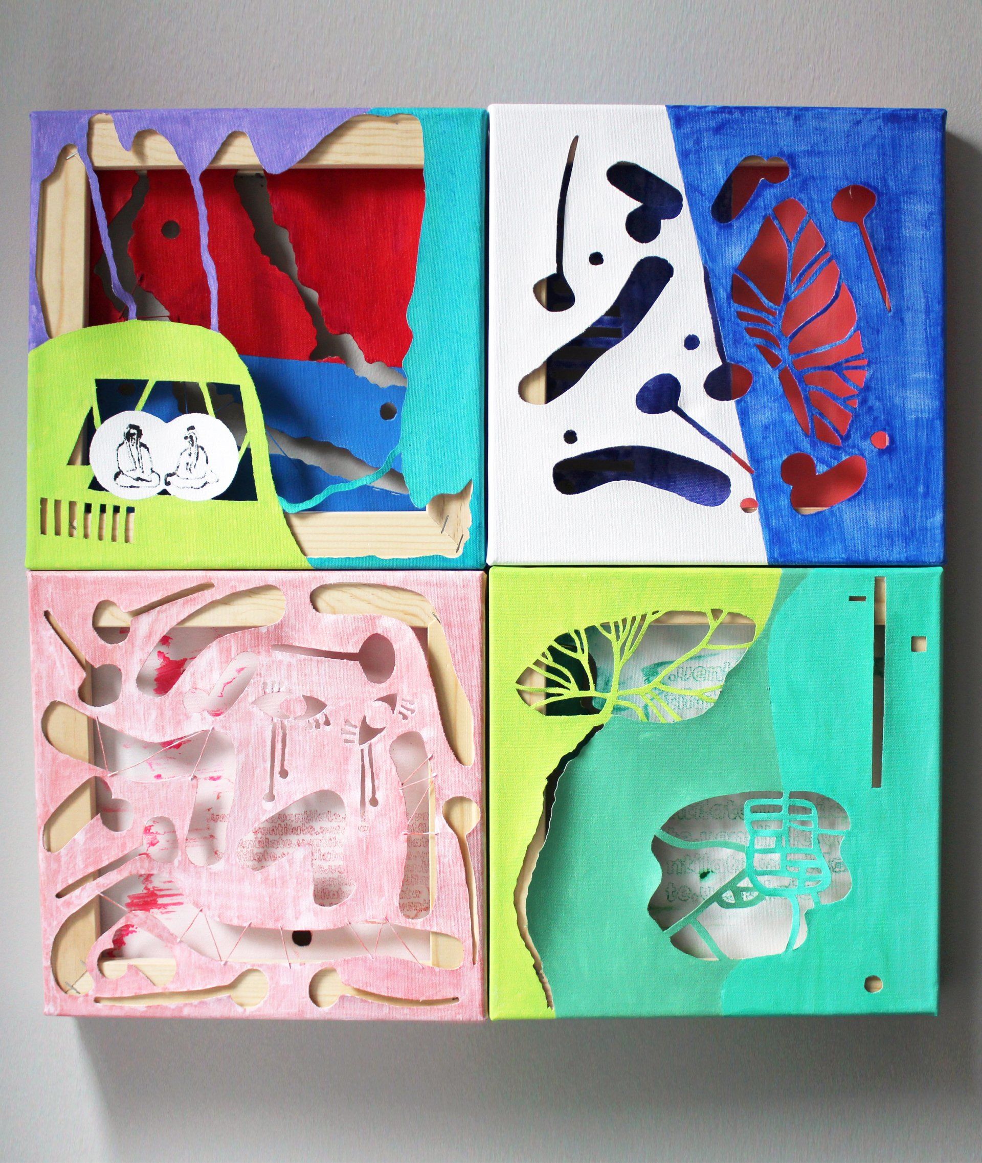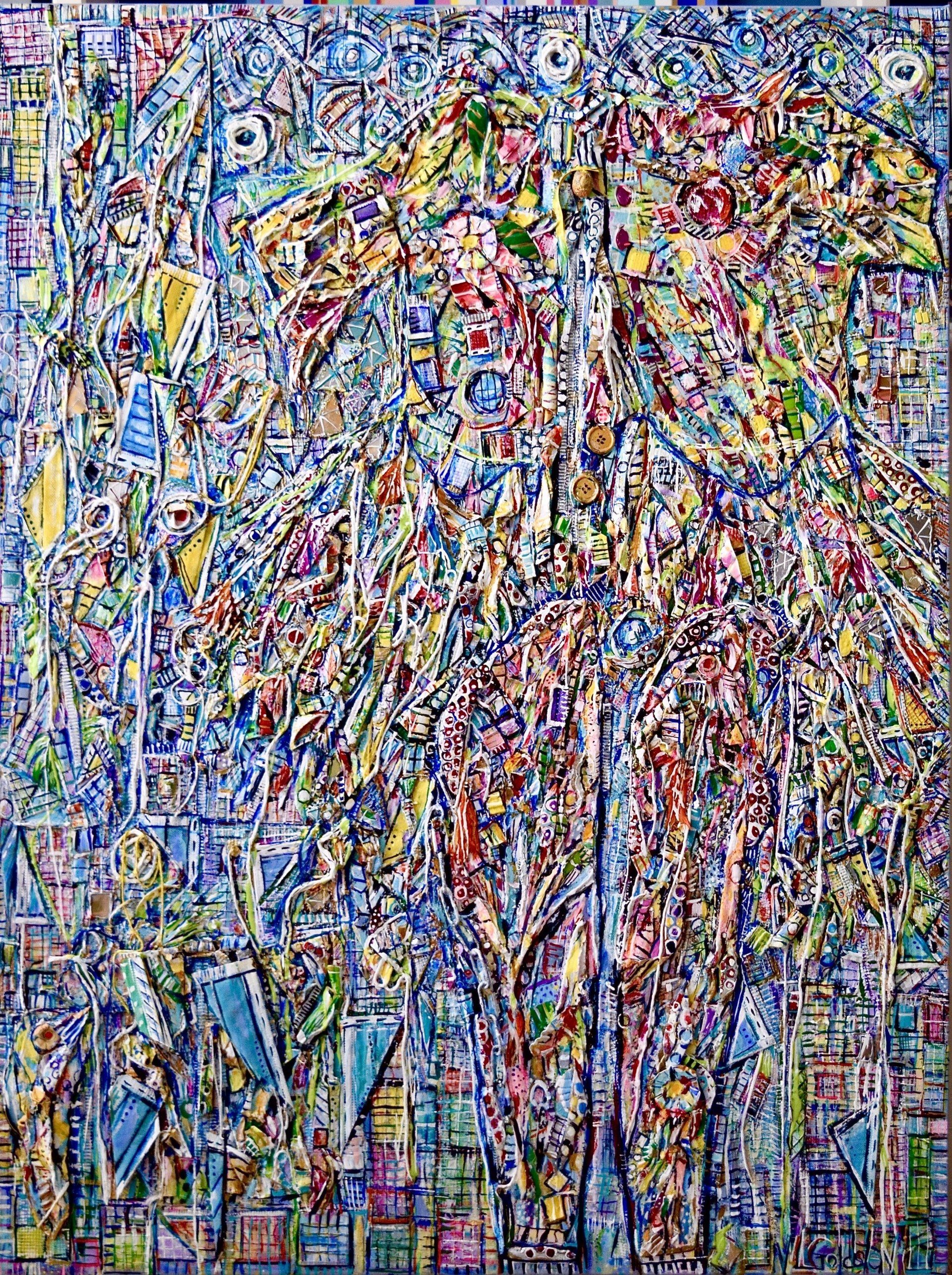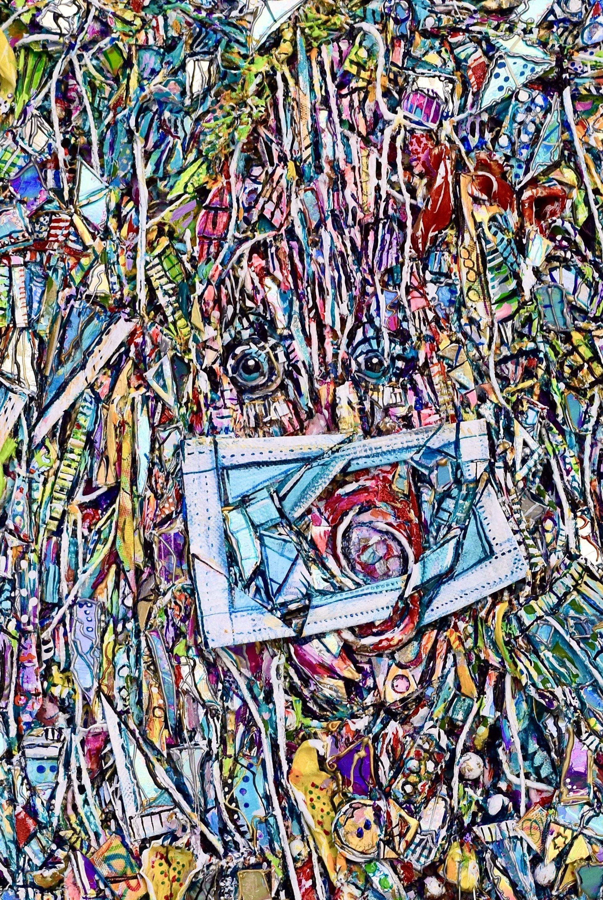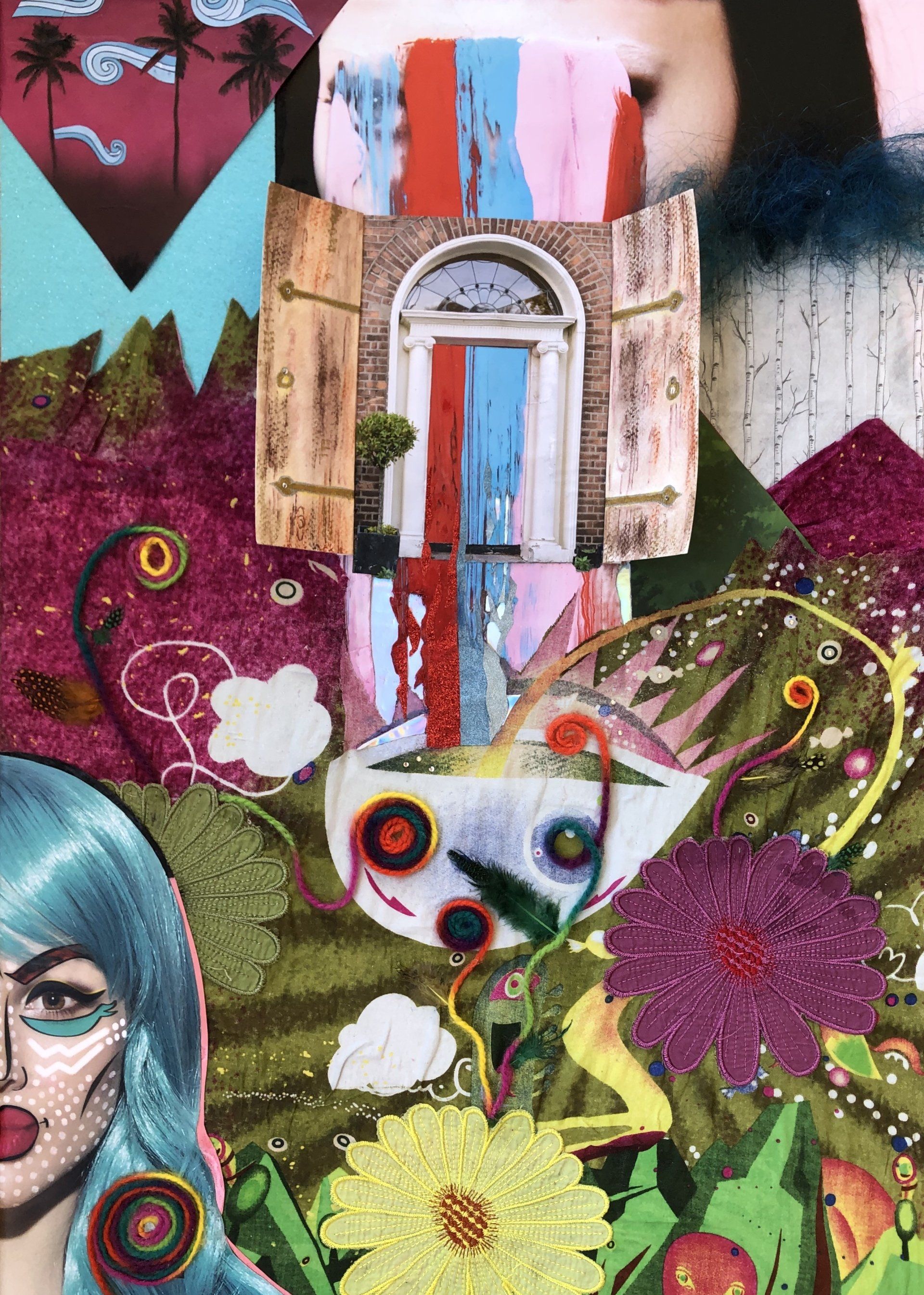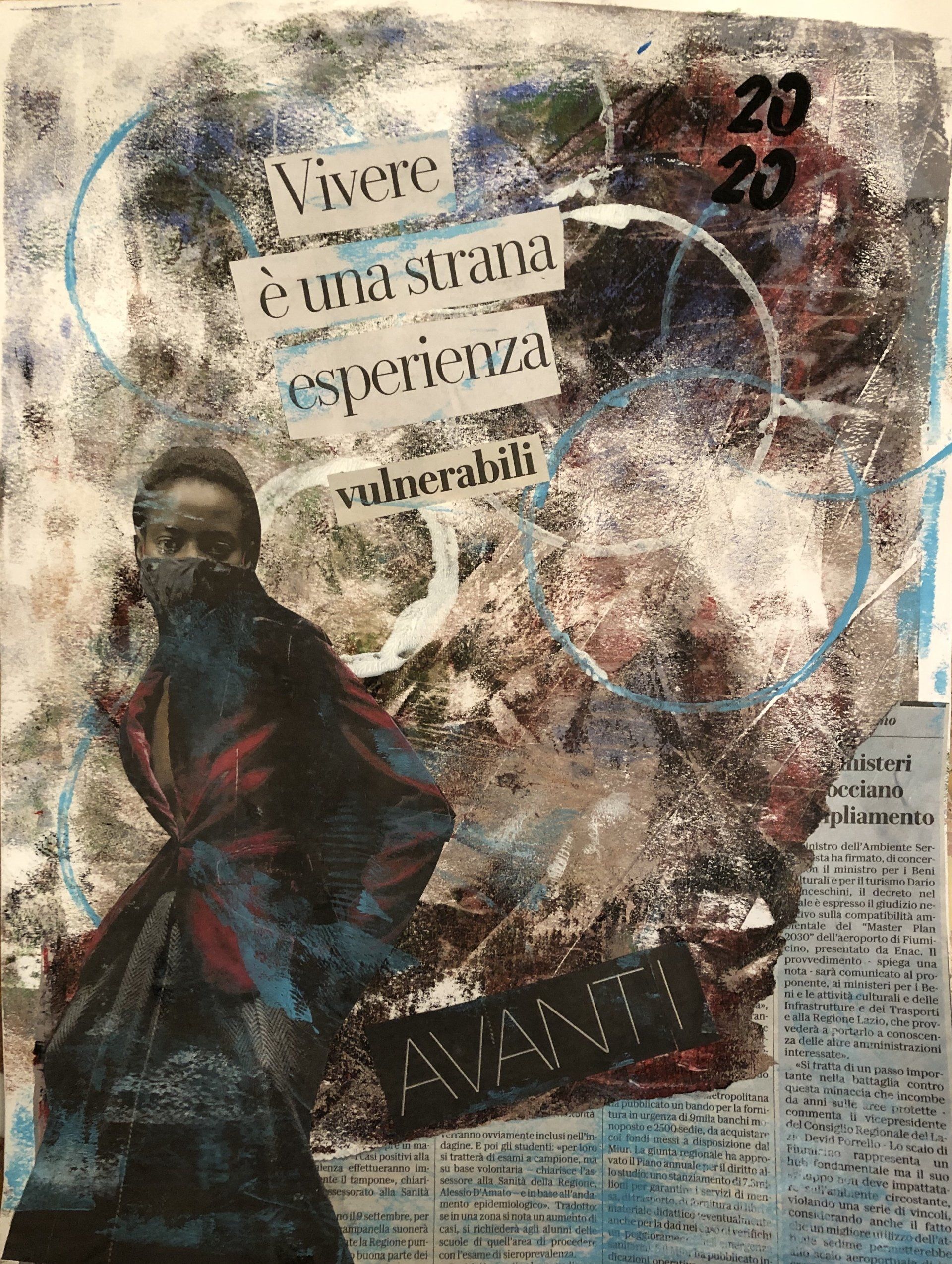 Lucia Pinzani, Quarantined Duende - In Catalonia the quarantine lasted ten weeks. Due to the impossibility of leaving the house to collect new materials, I worked continuously on the same canvas. Through collage and acrylic painting, the canvas became a scene in constant transformation. The result was an exploration of colorful visual changes; an inner journey that allowed me to keep track of my mental state during the quarantine.