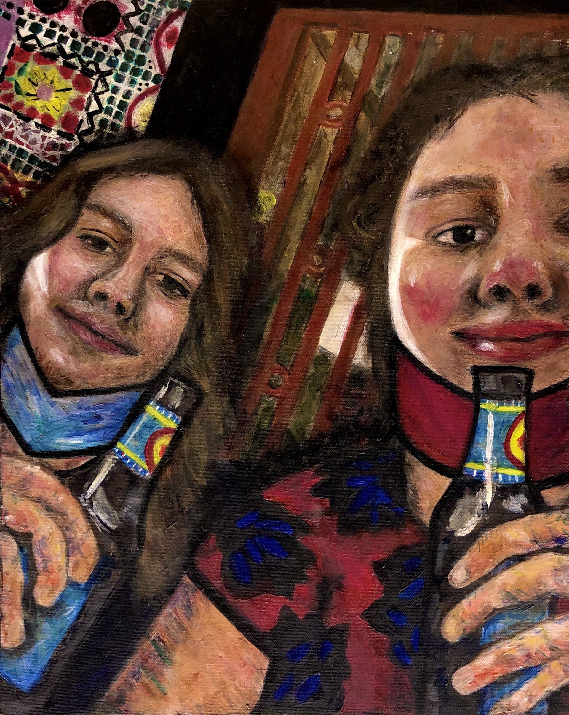 Helena Holland Breger, Summer in the City 2020 - Is a self-portrait of myself and my boyfriend, based on a selfie we took in late June 2020: We broke quarantine to vote, and we had a beer as we waited on the stoop of my childhood apartment to see my father for the first time since quarantine began. This portrait captures both this day as well as most of our summer. Like many others, COVID-19 left us unemployed, so we took daily walks, sitting on stoops, listening to music, talking about art, film or politics, enjoying beers, sometimes even playing the guitar and singing. These were moments of repose in a year of personal changes and global tragedy, and a summer where political tensions boiled over across the country.