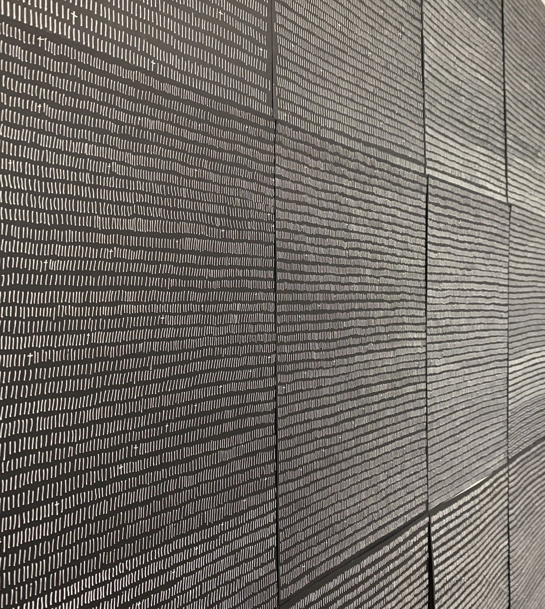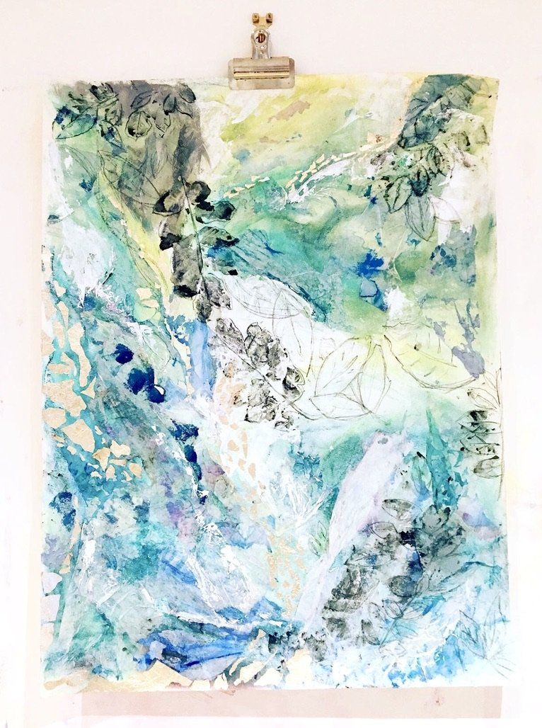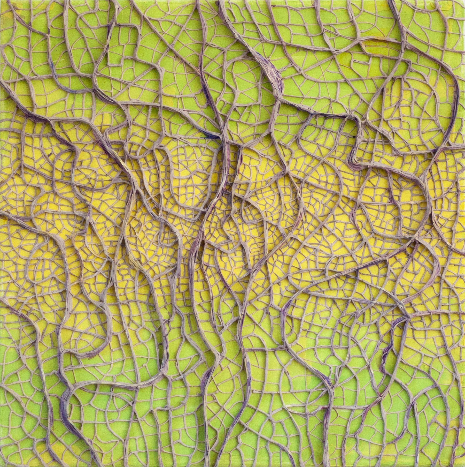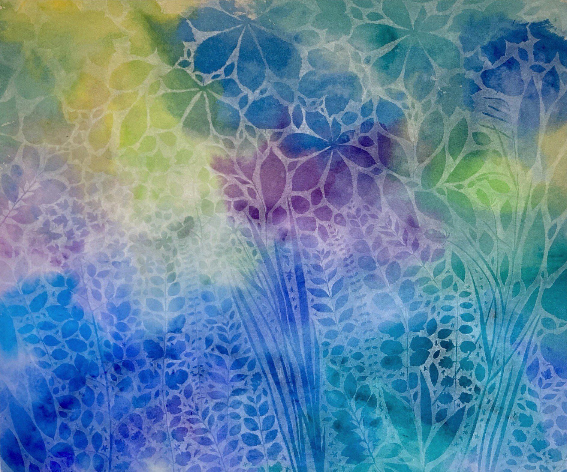 Beatrice Dina - The lake’s scent, Mixed media on cotton 180 x 150 cm - COVID-19 taught me that daily conversations with nature are a universal primal need. Months of isolation became suddenly manageable through daily walks on a quiet lake. As we strolled, I collected with my kids every leaf and flower that grows on the shore. We pressed and organised our organic collection at home, where the different shapes and scents took over my studio, creating a meditative blueprint. Every leaf I drew, kneeling on the unstretched canvas, became a prayer of gratitude to this magnificent earth that wants to breathe with us. It took a pandemic to stop and listen to our inner and outer world, my hope is that now we can all find a way to reconnect with nature, restore its wisdom and heal.