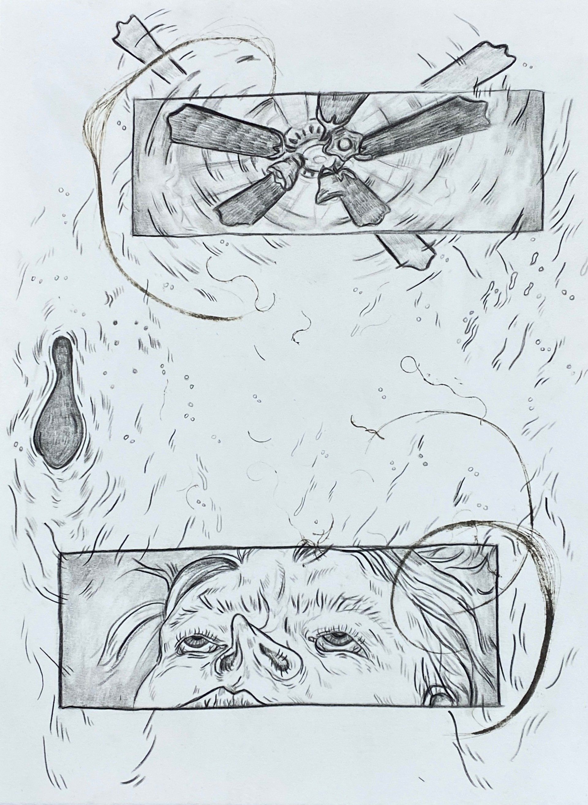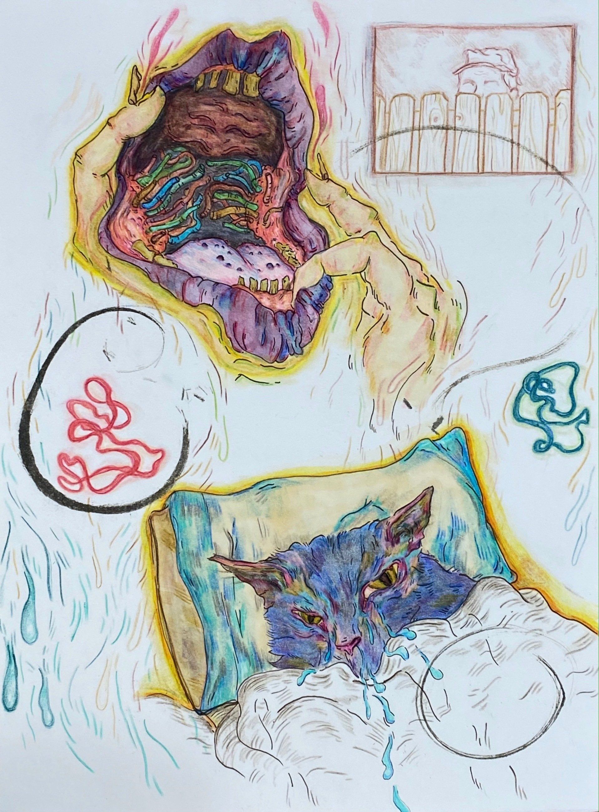 Bailey Jean Thomas, Unsettled - Unsettled is a 9 x 12 in.mixed media drawing. Unsettled is about isolation and the feeling of uncertainty that comes with spending too much time with one’s self. Without the company of others, your mind and sense of identity is left dangling like a hazardously installed ceiling fan and the dust that accumulates on it. With too much time to yourself, you may start thinking about how the dust that is now floating through the air was once part of your body. You may think about how the air between us is constantly filled with tiny pieces of ourselves, pieces that could cause harm or sickness to others.