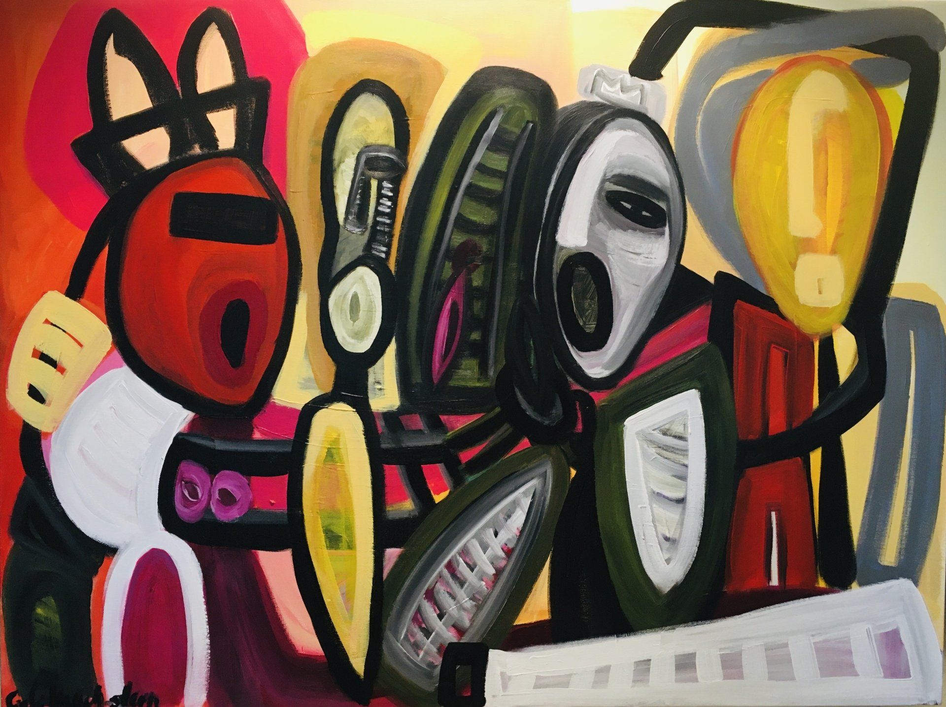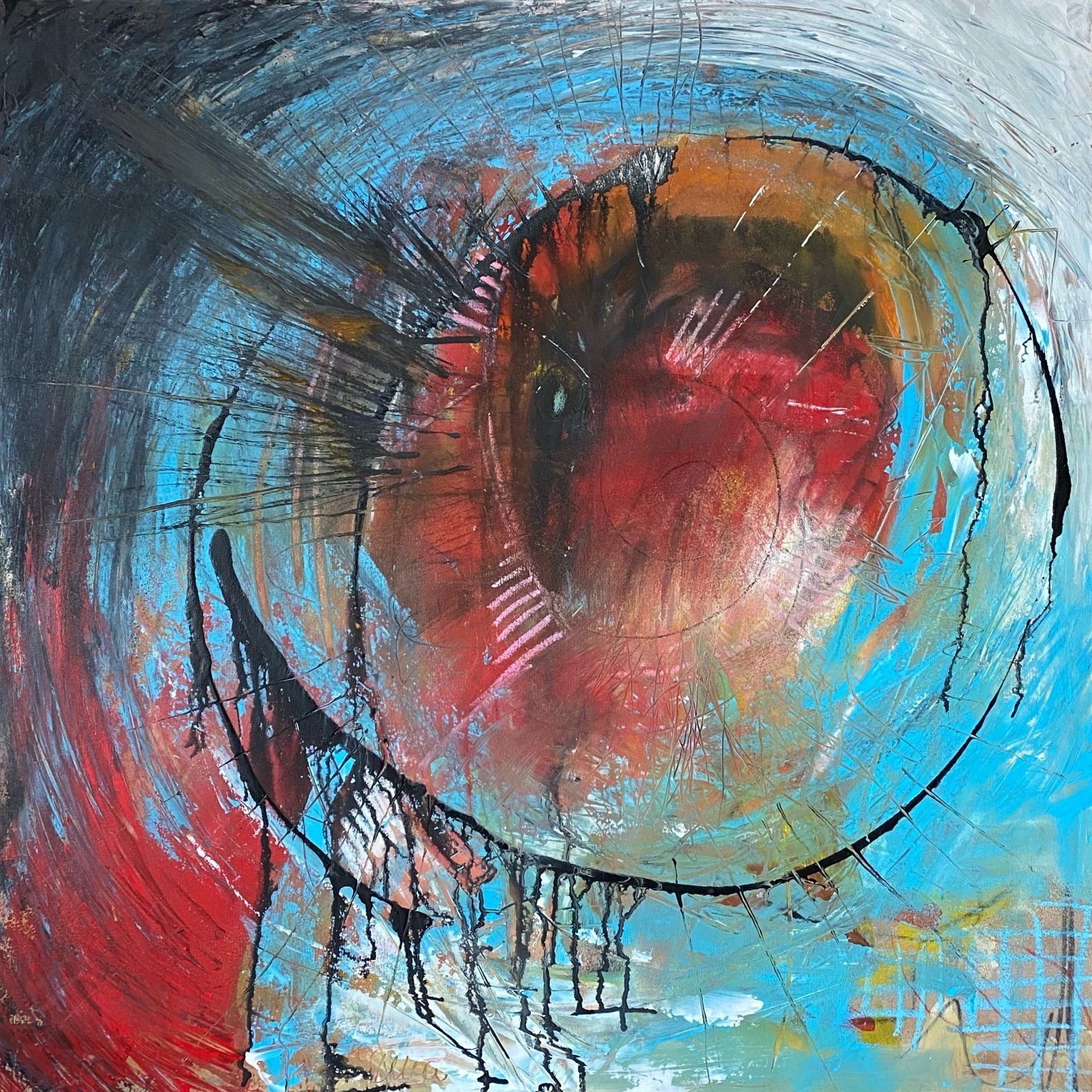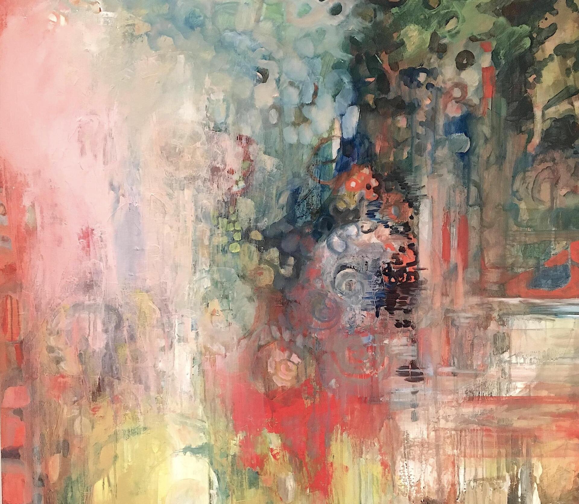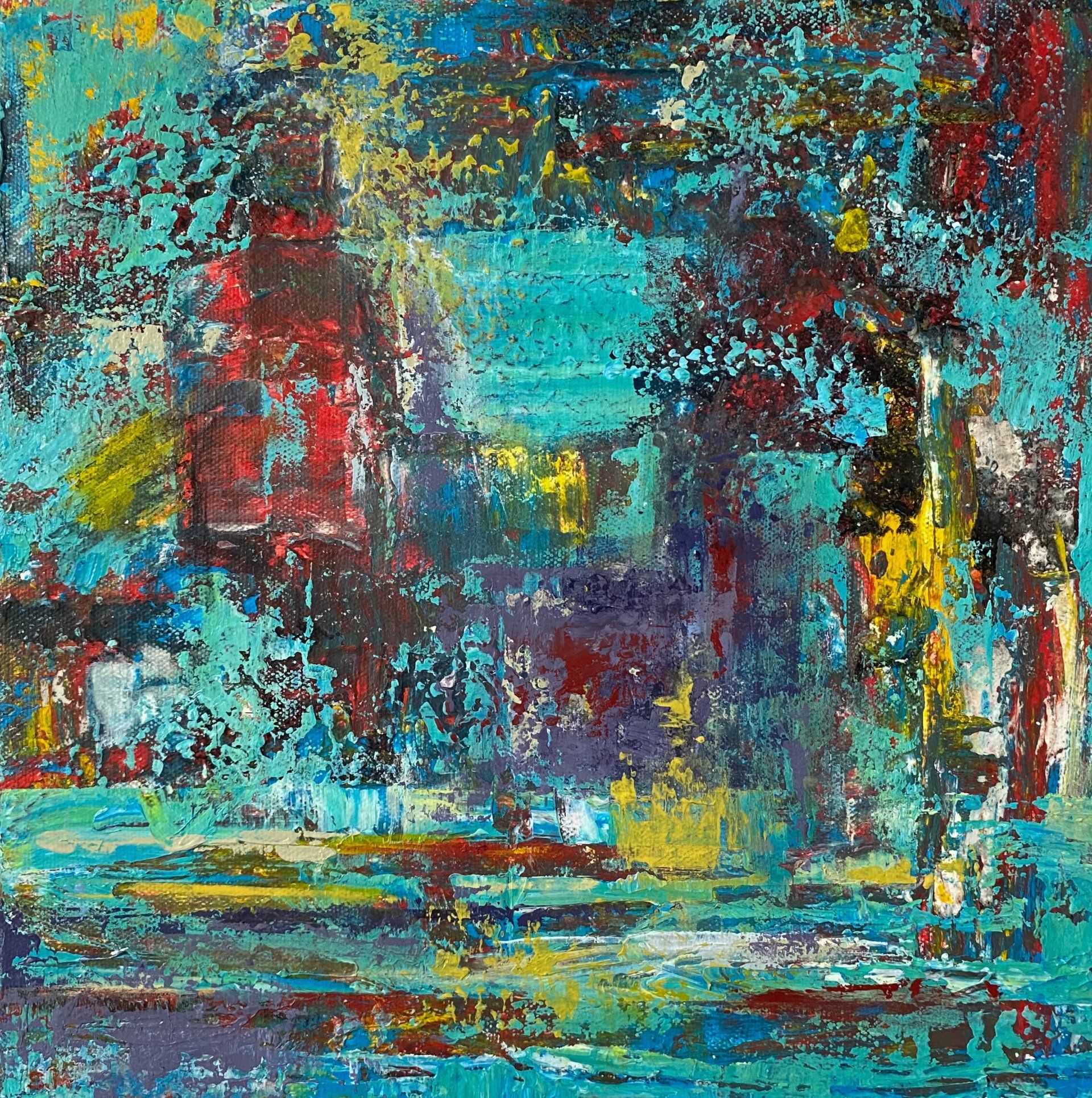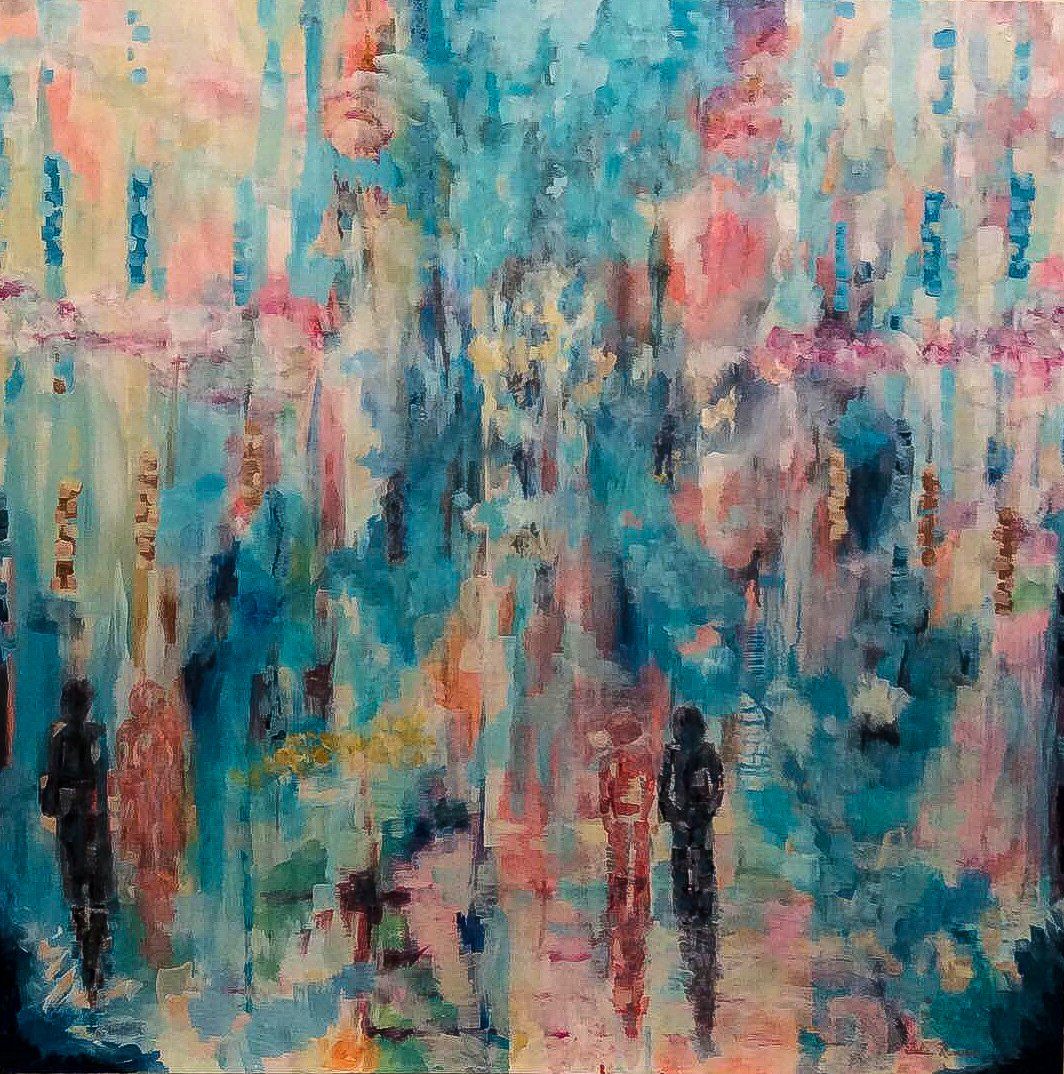 Julie Himelein, Race To Paradise - I know the world seems a little gloomy out there now... Let’s look for peace, harmony, and love. May the light shine again upon all of us. A future where we can explore all our beautiful cities and countrysides again. When isolation , sadness and loneliness are but distant memories. Paradise is just around the corner. Acrylic 36” by 36” on gallery wrapped canvas